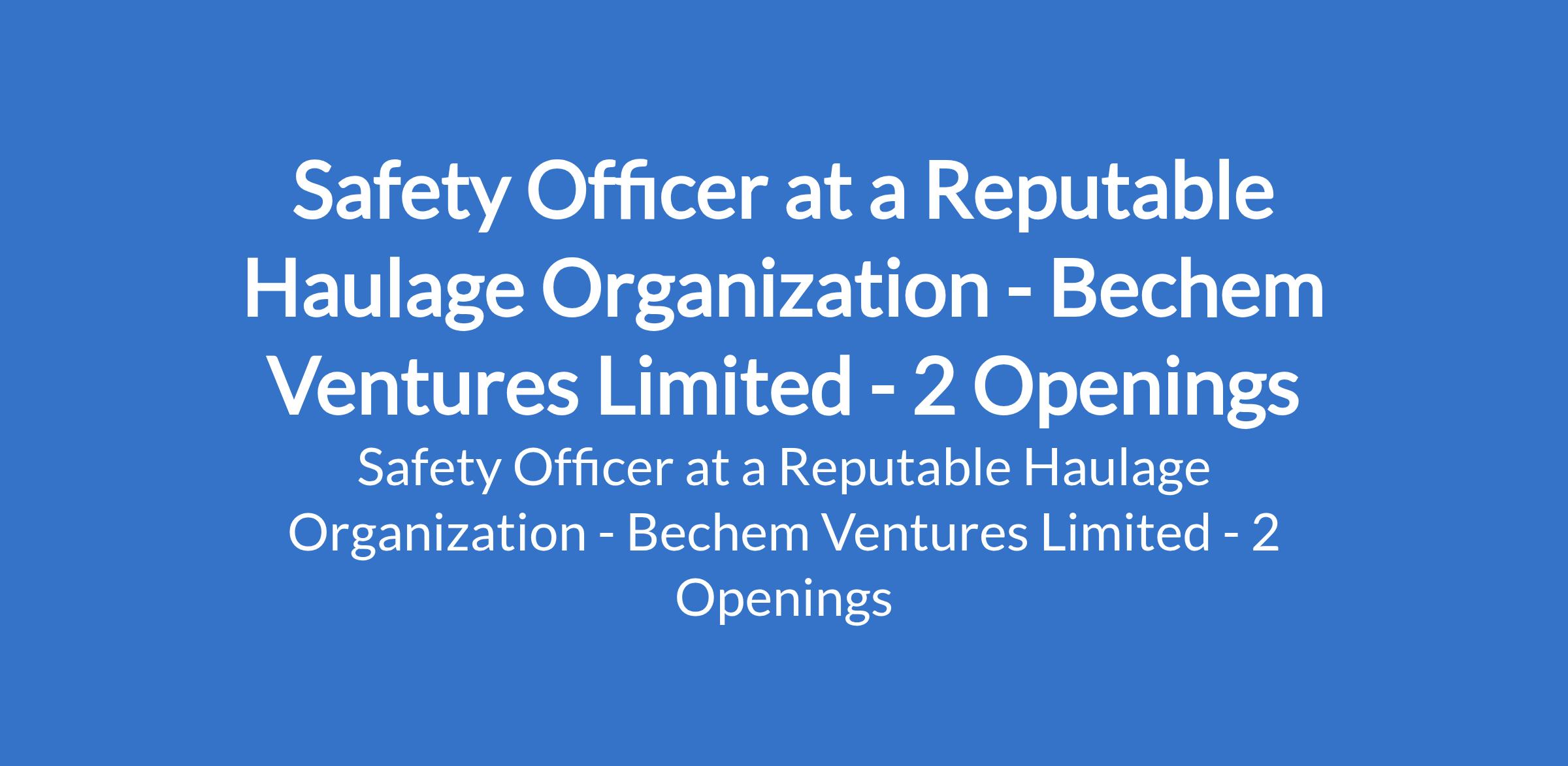 Bechem Ventures Limited - Our client, a Reputable Haulage Organization is recruiting to fill the position of: Safety Officer. The position is located in Calabar - Cross River, and Lagos States. Salary Range: N150,000 N500,000 per month. Interested candidates should possess relevant qualifications with experience.