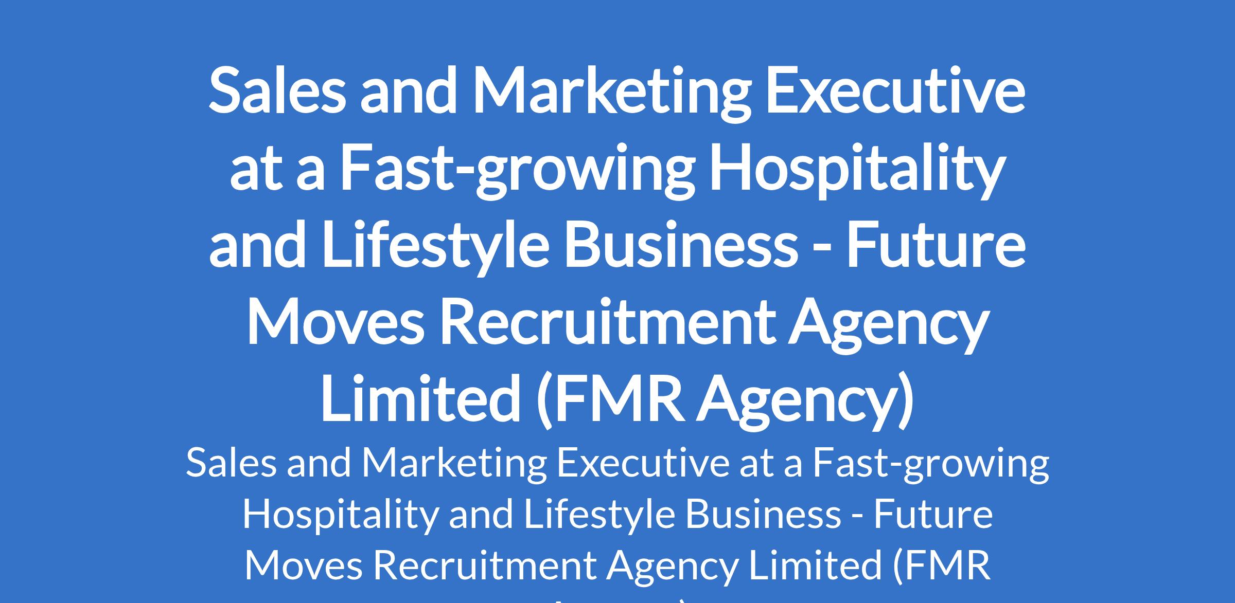 Future Moves Recruitment Agency Limited (FMR Agency) - Our client, a fast-growing hospitality and lifestyle business is recruiting to fill the position of: Sales and Marketing Executive. The position is located in Lagos State. Salary: N200,000 - N500,000 monthly. Interested candidates should possess minimum of OND / HND / BSc Degree in Marketing, Business Administration, or a related field with 3 - 4 years experience in sales and/or marketing (hospitality, lifestyle, or wellness industry preferred).