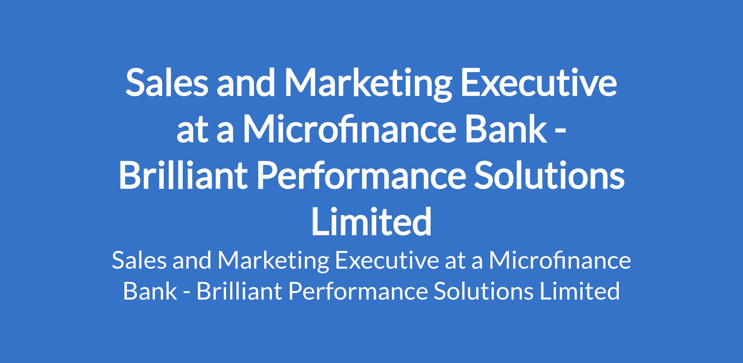 Brilliant Performance Solutions Limited - Our client, a Microfinance Bank is recruiting to fill the position of: Sales and Marketing Executive. The position is located in Ipaja, Lagos State. Interested candidates should possess relevant qualifications.