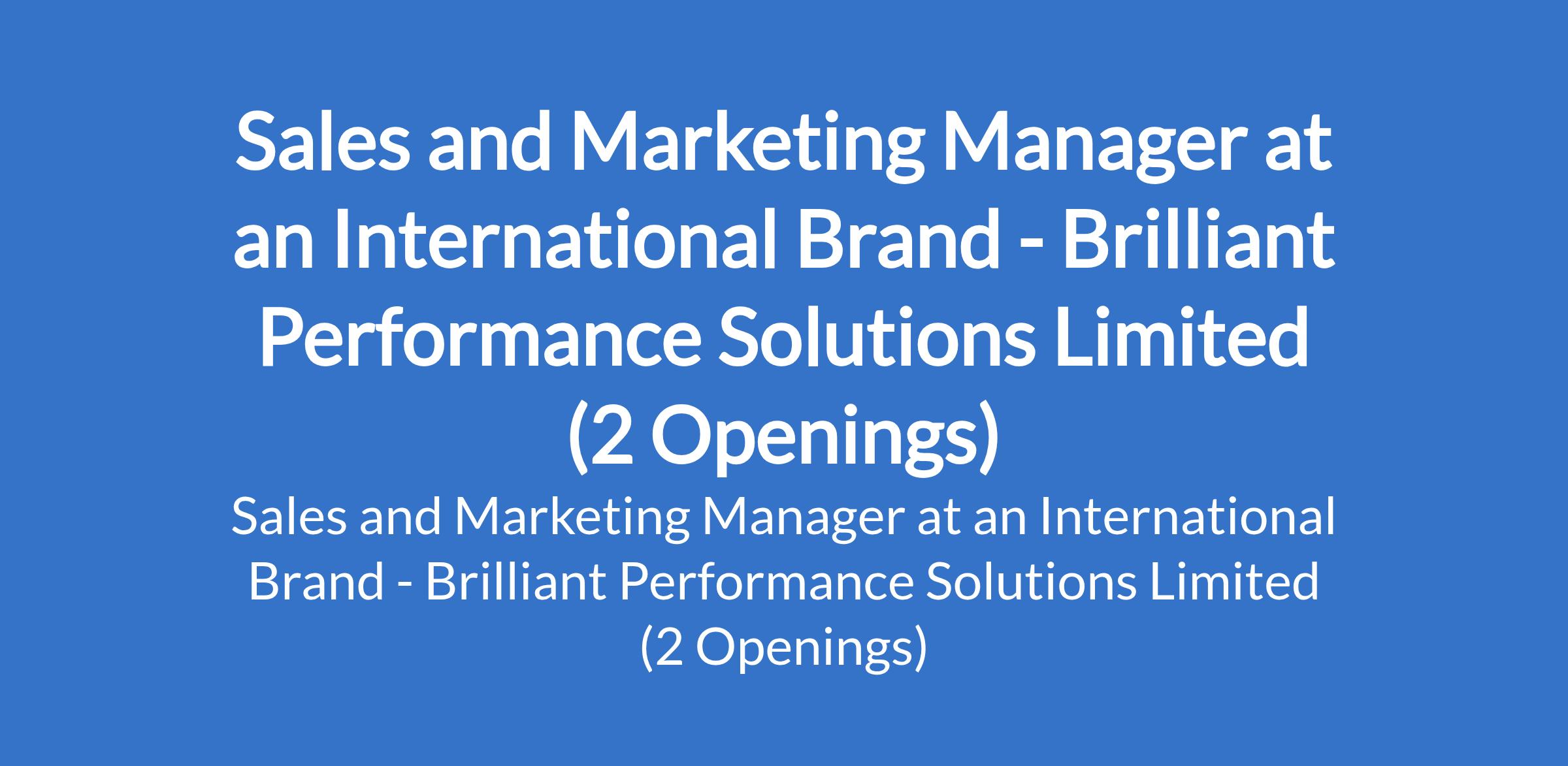 Brilliant Performance Solutions Limited - Our client, an International Brand is recruiting to fill the position of: Sales and Marketing Manager. The position is located in Lagos mainland and Island - Lagos State. Interested candidates should possess a relevant qualification.