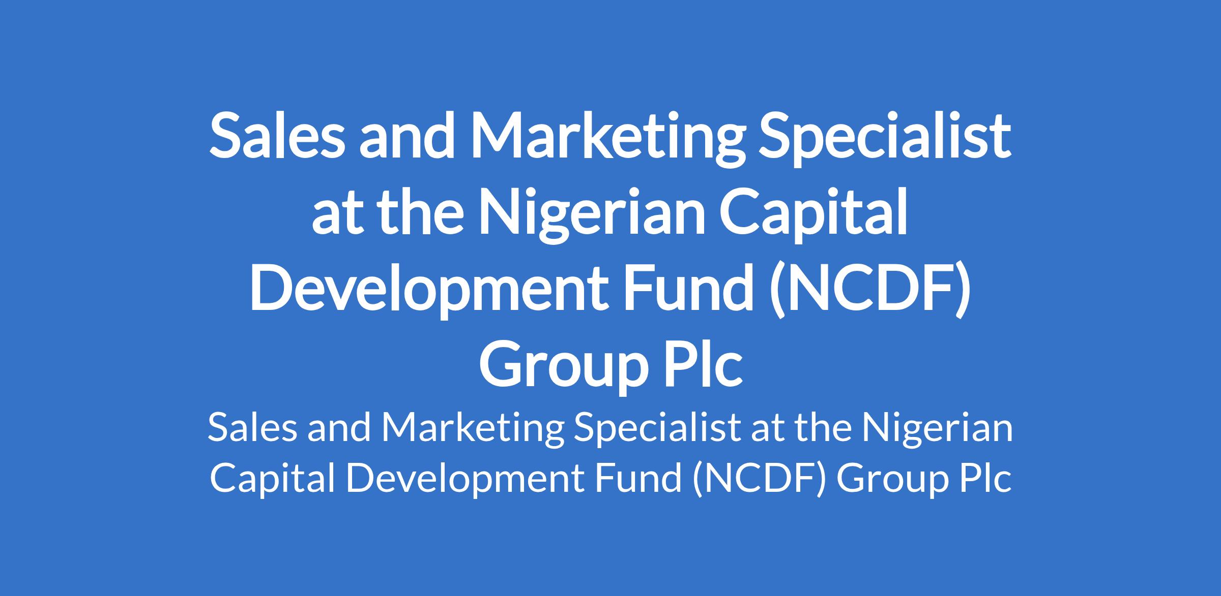 The Nigerian Capital Development Fund (NCDF) Group Plc is recruiting to fill the position of: Sales and Marketing Specialist. The position is located in Ibadan, Oyo State. Interested candidates should possess relevant qualifications with strong communication, marketing, and relationship-building skills.