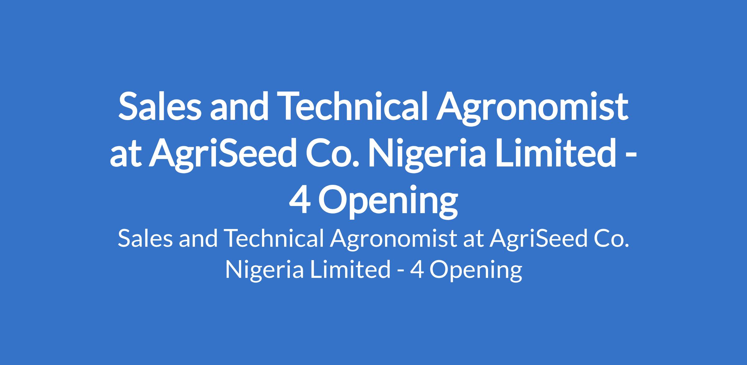 AgriSeed Co. Nigeria Limited is recruiting to fill the position of: Sales and Technical Agronomist. The position is located in Malumfashi - Katsina, Minna - Niger, Jalingo - Taraba and Nasarawa States. Interested candidates should possess relevant qualifications with 1 - 2 years of experience.