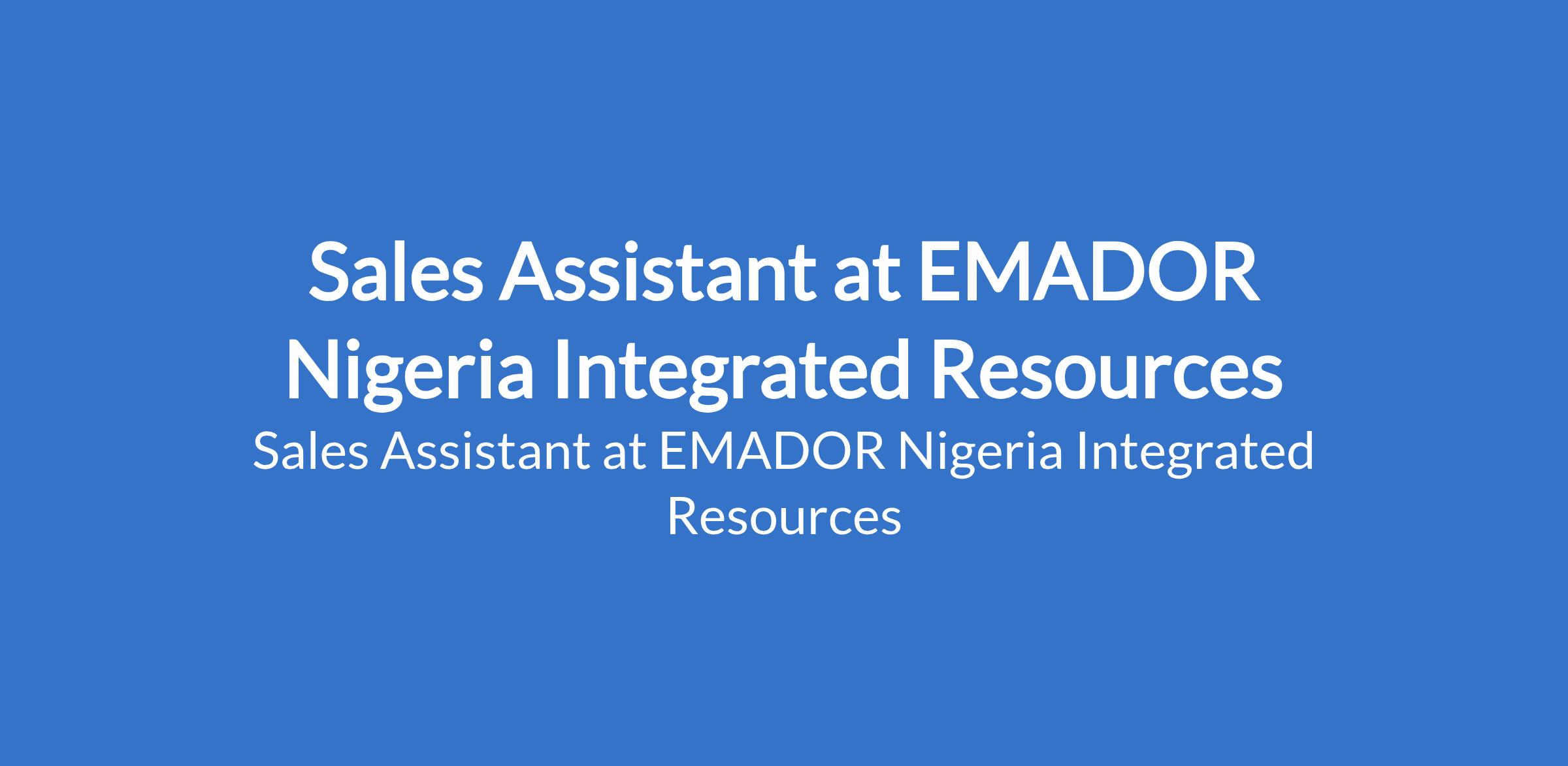 EMADOR Nigeria Integrated Resources is recruiting to fill the position of: Sales Assistant. The position is located in Ikeja, Lagos State. Salary: N100,000 - N150,000 monthly. Interested candidates should possess an OND, HND, or Bachelor's Degree with 2 years experience.