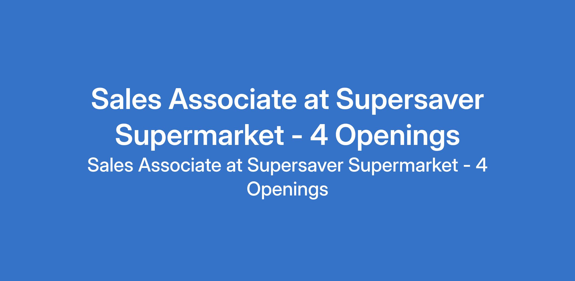 Supersaver Supermarket is recruiting to fill the position of: Sales Associate. The position is located in Ago - Okota, Ajao, Lekki - Admiralty &Lekki - Osapa, Lagos State. Salary: N70,000 - N110,000 per month. Interested candidates should possess a minimum of SSCE / GCE / NECO qualification with 1+ years relevant work experience.