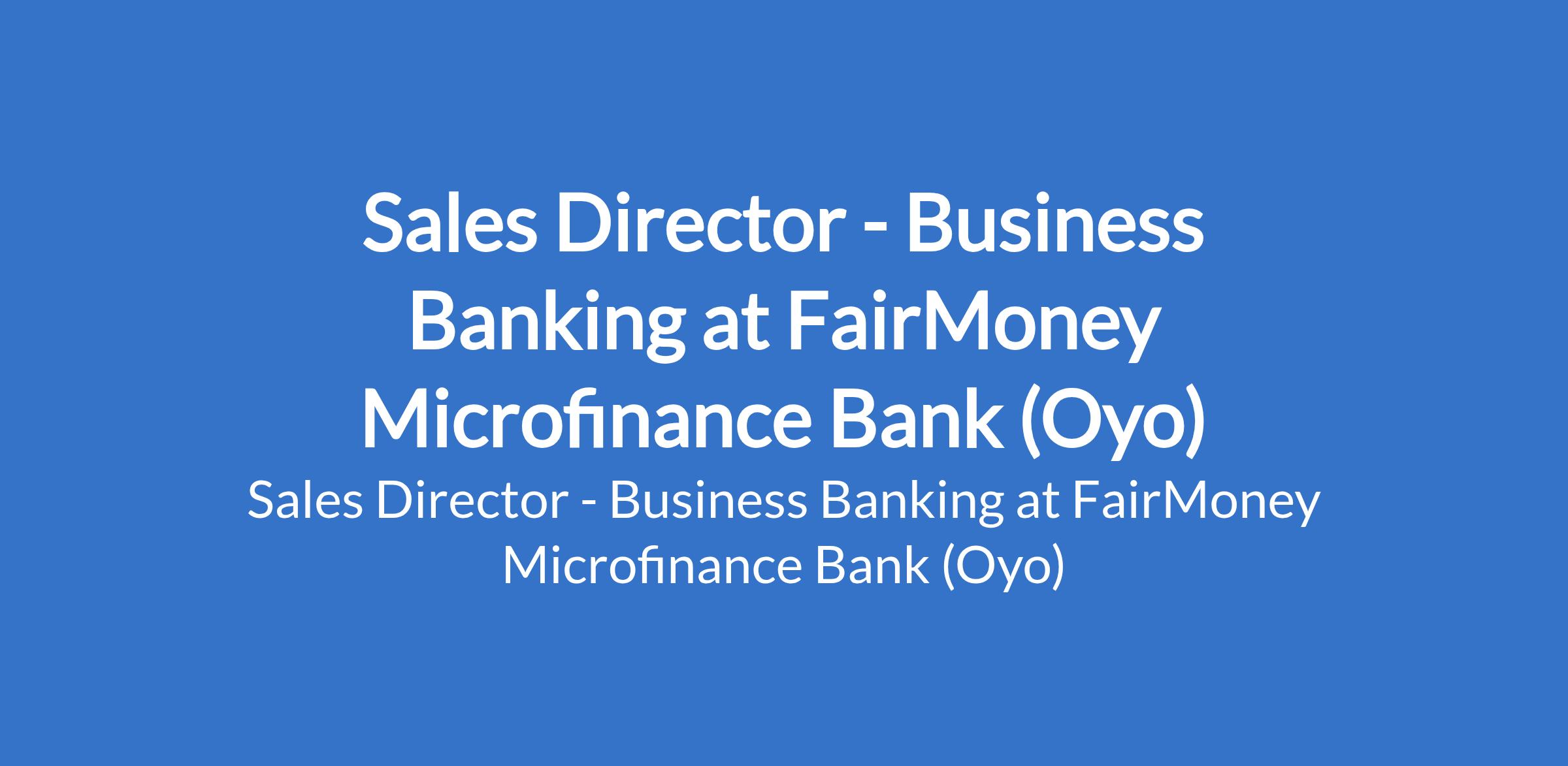Fairmoney Microfinance Bank is recruiting to fill the position of: Sales Director - Business Banking. The Position is Located in Ibadan, Oyo State. Interested candidates should possess a Bachelors Degree in Finance, Business Administration, Economics, or a related discipline with 10 - 15 years of experience in business/merchant lending, SME banking, or fintech credit, with regional leadership exposure within a commercial bank.