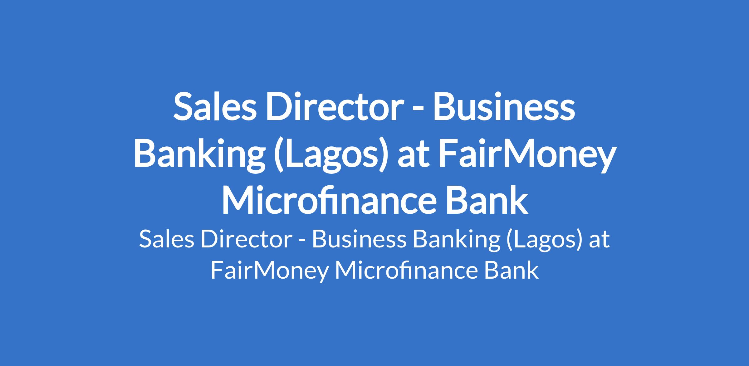 Fairmoney Microfinance Bank is recruiting to fill the position of: Sales Director - Business Banking. The Position is Located in Lagos State. Interested candidates should possess a Bachelors Degree in Finance, Business Administration, Economics, or a related discipline with 10 - 15 years of experience in business/merchant lending, SME banking, or fintech credit, with regional leadership exposure within a commercial bank.