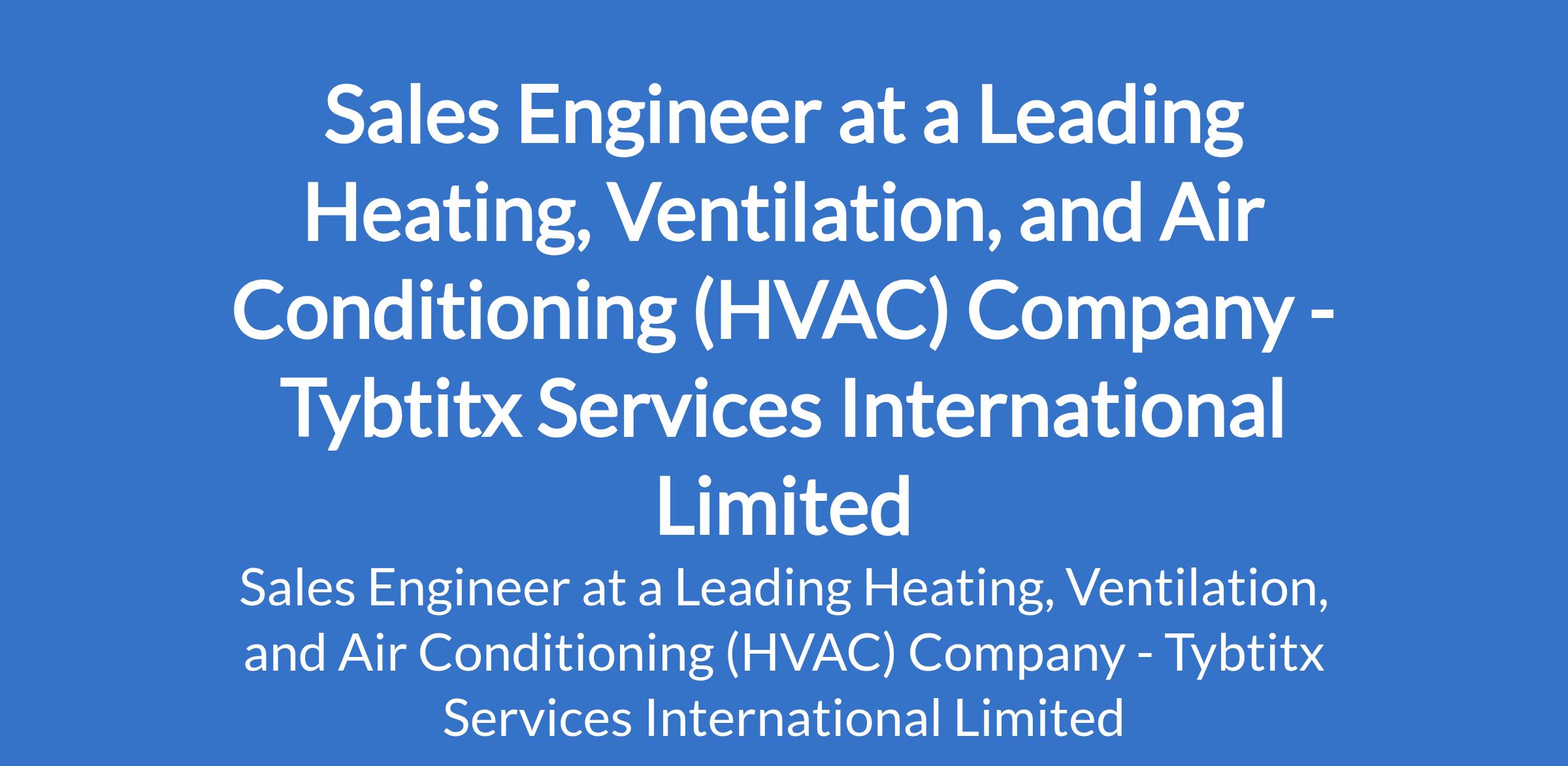 Tybtitx Services International Limited - Our client, a Heating, Ventilation, and Air Conditioning company is recruiting to fill the position of: Sales Engineer. The position is located in Ikoyi, Lagos State. Interested candidates should possess a Bachelors Degree in Business, Engineering, IT, Computer Science, Mechanical Engineering, or a related field with 3 - 7 years of experience in B2B sales within HVAC.
