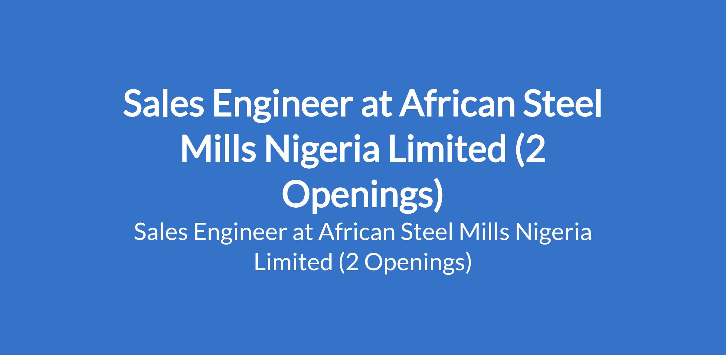 African Steel Mills Nigeria Limited is recruiting to fill the position of: Sales Engineer. The position is located in Lagos & Port Harcourt, Rivers States. Interested candidates should possess a Bachelors Degree in Mechanical Engineering, Industrial Engineering, or a related field with 3 7 years of experience in a Sales Engineering role.