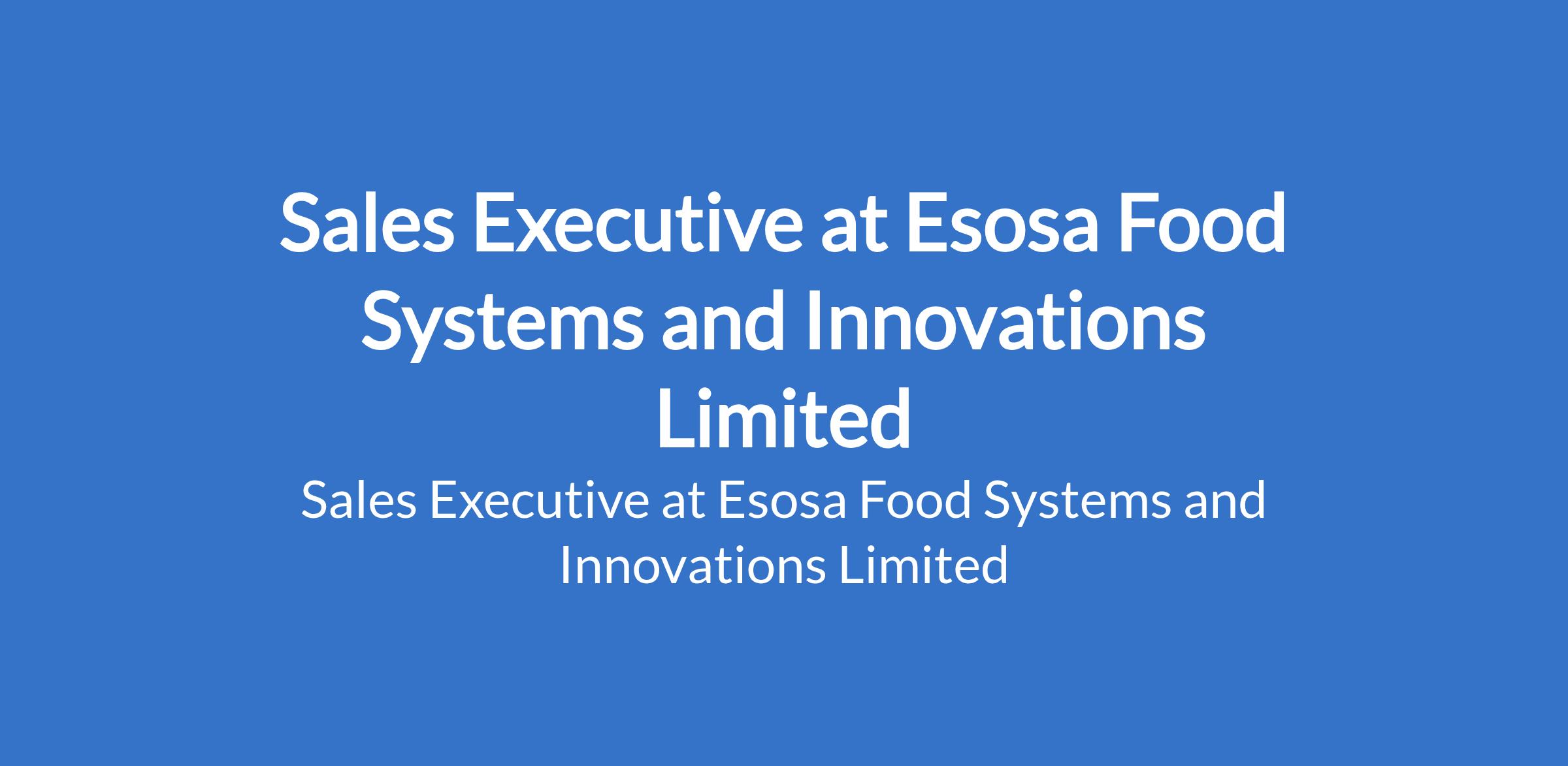 Esosa Food Systems and Innovations Limited is recruiting to fill the position of: Sales Executive. The position is located in Iju-Ishaga and Mende, Maryland, Lagos State. Salary: N100,000 - N500,000 per month. Interested candidates should possess relevant qualifications with experience.
