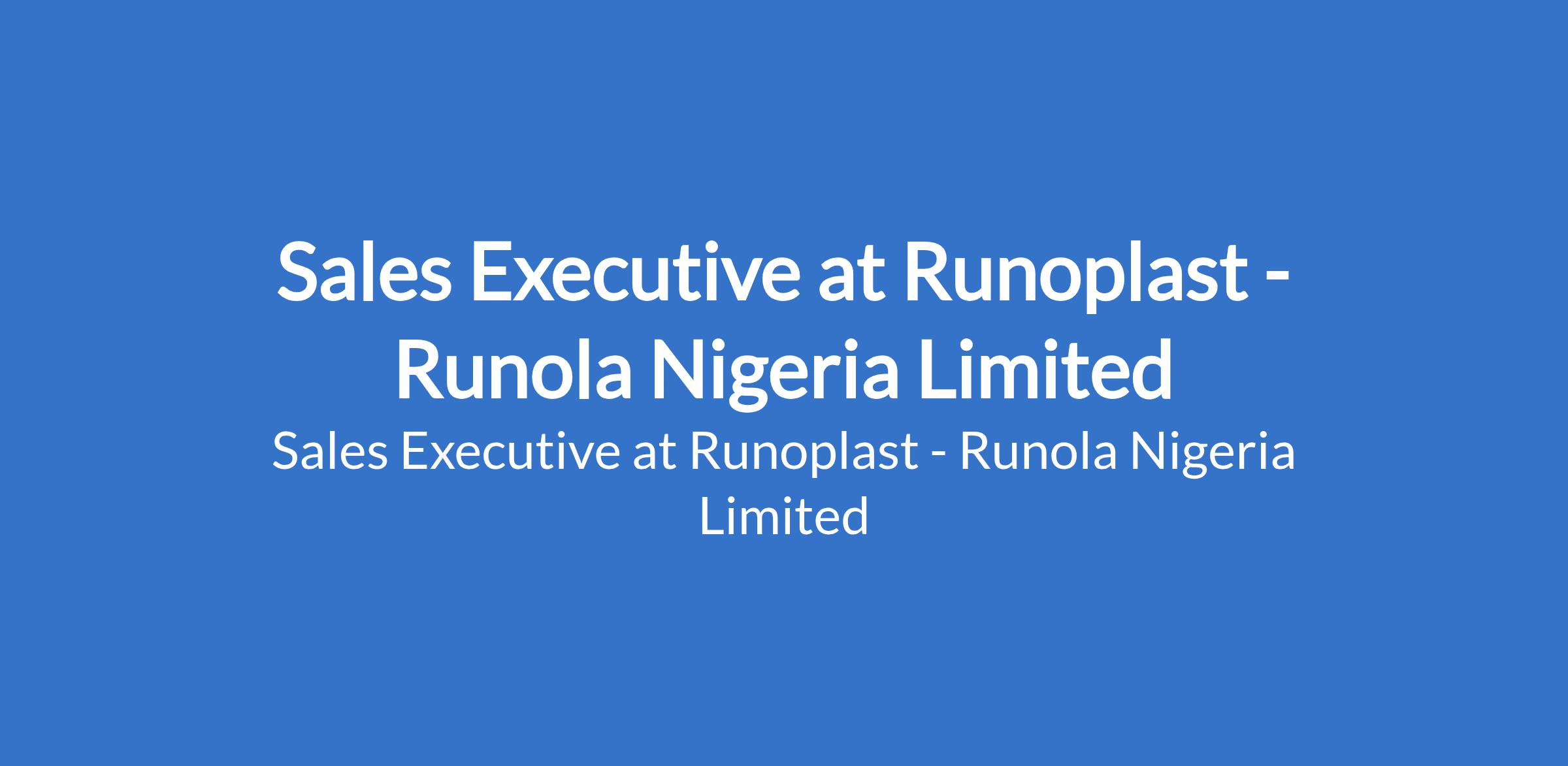 Runola Nigeria Limited - Our subsidiary, Runoplast is recruiting to fill the position of: Sales Executive. The position is located in Asaba, Delta State. Interested candidates should possess a minimum of OND / NCE qualification, an HND / B.Sc Degree in Marketing, Business Admin, or related fields is an advantage, with a minimum of 2 years hands-on experience in sales or marketing (experience in plastics, packaging, or FMCG industry is a plus), and must be familiar with local markets and available to travel.
