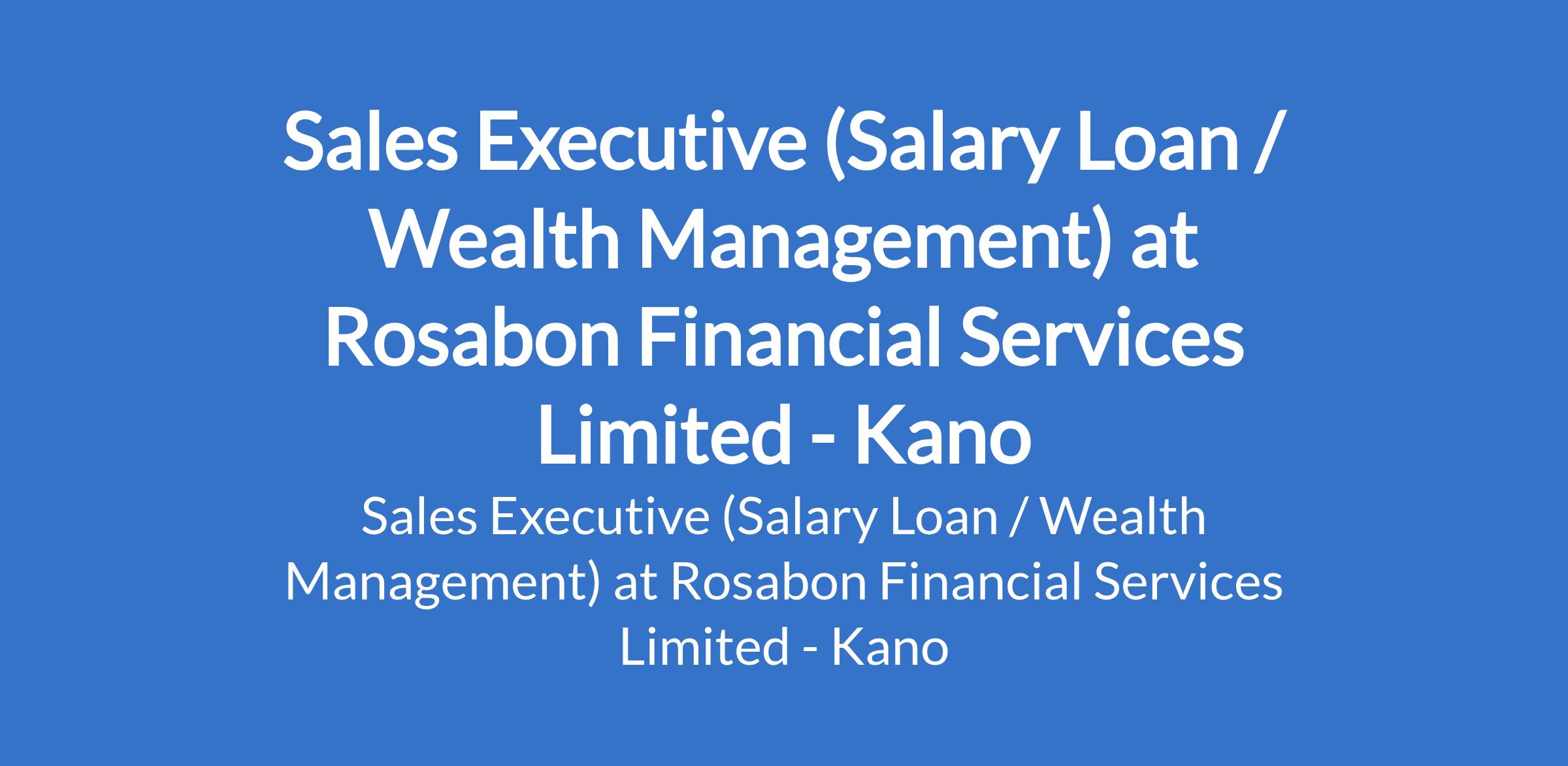 Rosabon Financial Services (RFS) Limited is recruiting to fill the position of: Sales Executive (Salary Loan / Wealth Management). The position is located in Kano State. Salary: N80,000 - N150,000 monthly. The ideal candidate will be tasked with the responsibility of selling various loan products. Interested candidates should possess a B.Sc Degree in Finance, Economics or a related field with proven working experience as a Loan Officer.