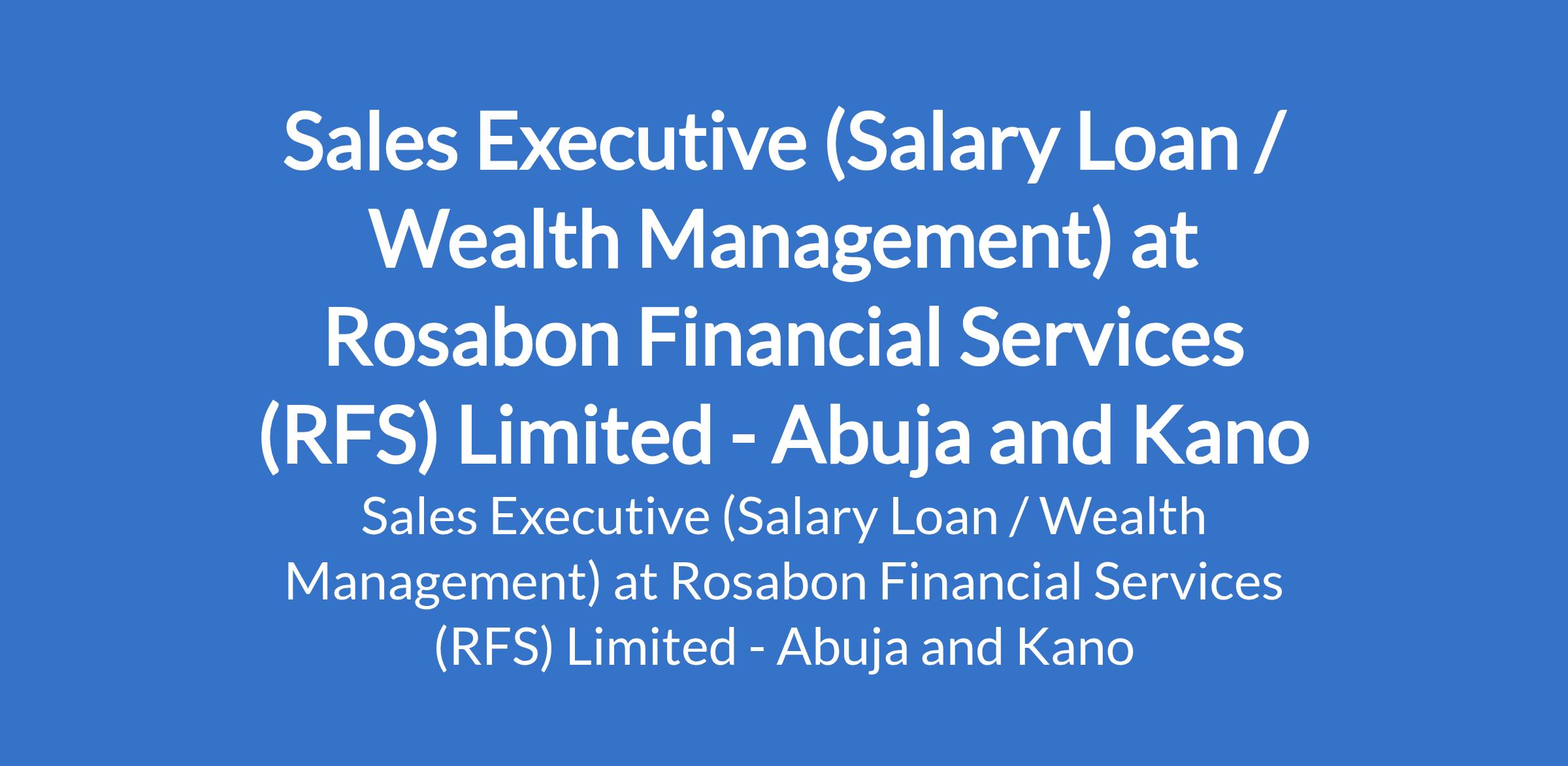 Rosabon Financial Services (RFS) Limited is recruiting to fill the position of: Sales Executive (Salary Loan / Wealth Management). The position is located in Abuja (FCT) and Kano State. Salary: N80,000 - N150,000 / month. Interested candidates should possess a B.Sc Degree in Finance, Economics or a related field with proven working experience as a Loan Officer.