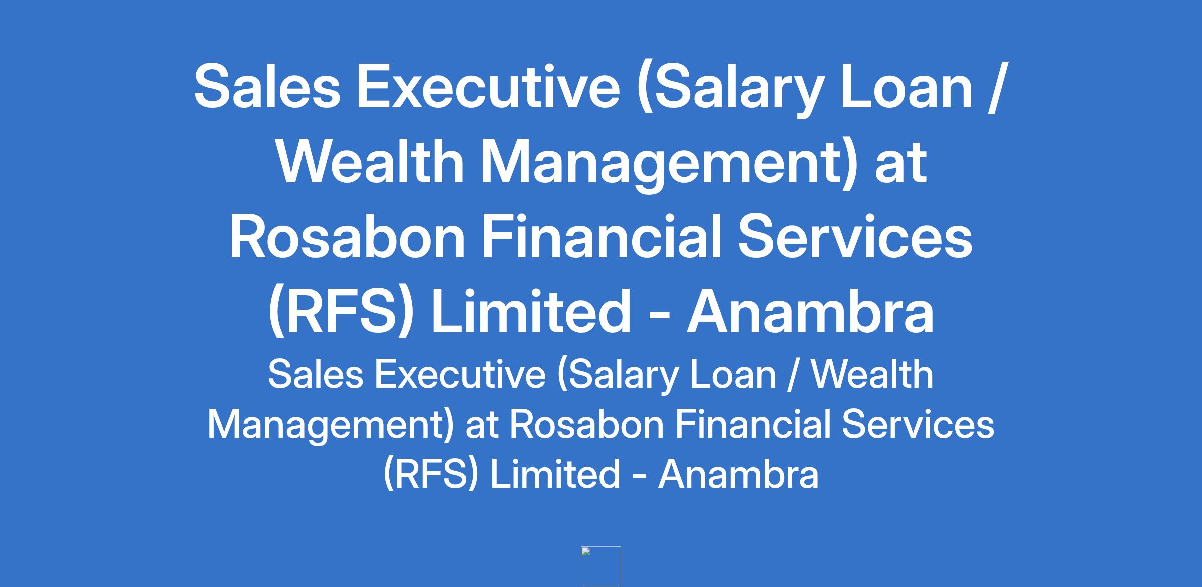 Rosabon Financial Services is recruiting to fill the position of: Sales Executive (Salary Loan / Wealth Management). The position is located in Anambra State. Salary: N70,000 - N150,000 per month. Interested candidates should possess a B.Sc Degree in Finance, Economics or a related field with proven working experience as a Loan Officer.