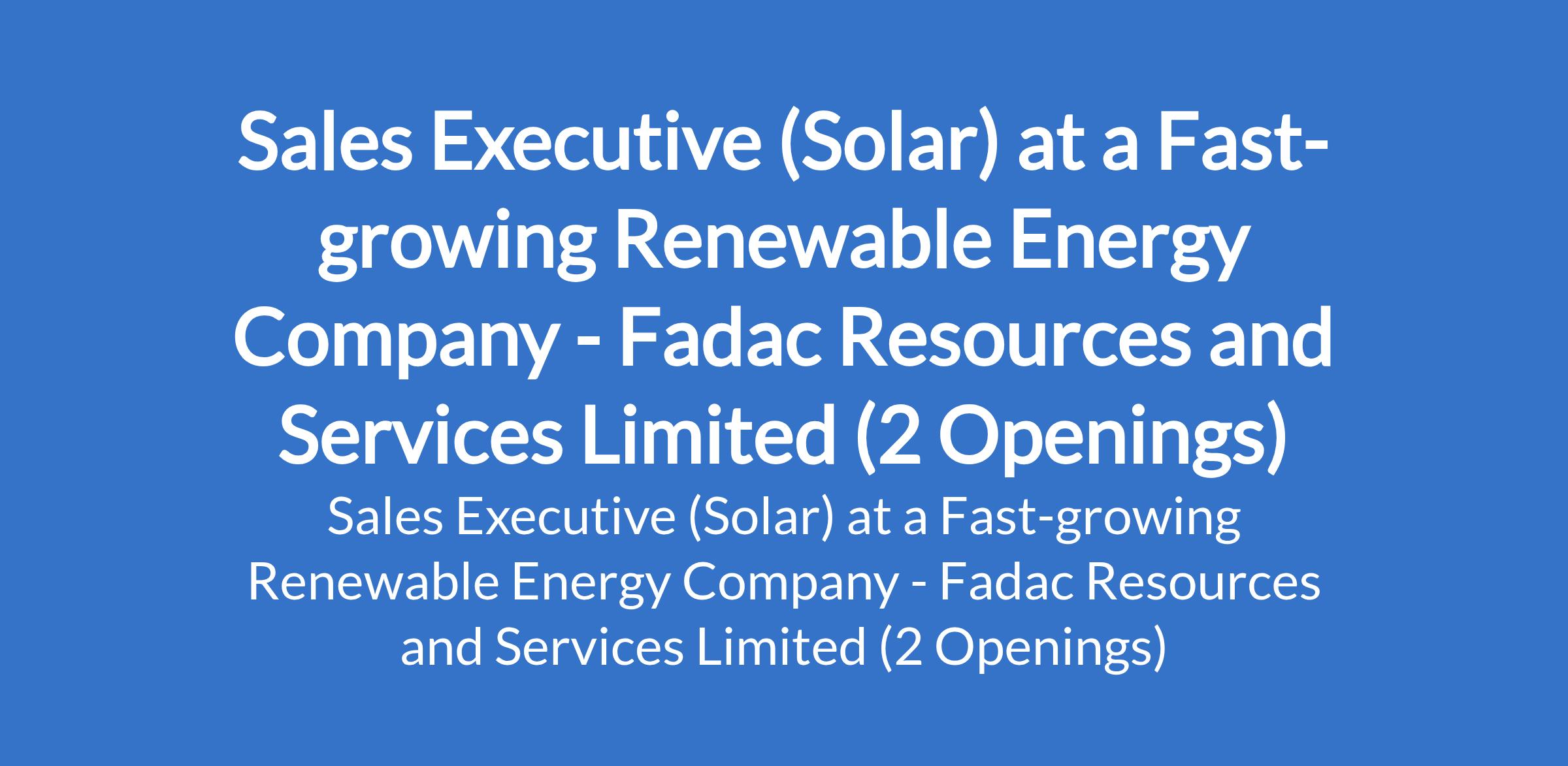 Fadac Resources and Services Limited - Our client, a fast-growing company in the renewable energy sector is recruiting to fill the position of: Sales Executive (Solar). The position is located in Kano and Oyo States. Interested candidates should possess a minimum of HND qualification with 3 7 years of sales experience, preferably in solar or renewable energy products.