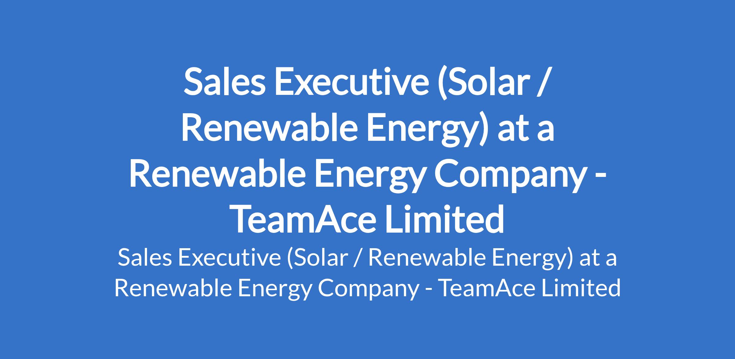 TeamAce Limited - Our client, a Renewable Energy Company is recruiting to fill the position of: Sales Executive (Solar / Renewable Energy). The position is located in Lagos State. Salary: N200,000 - N300,000 monthly. Interested candidates should possess minimum of an OND qualification in any related field with 2 - 3 years proven experience in sales, preferably within the solar or renewable energy industry, and must be based in Lagos and willing to work in a hybrid environment.