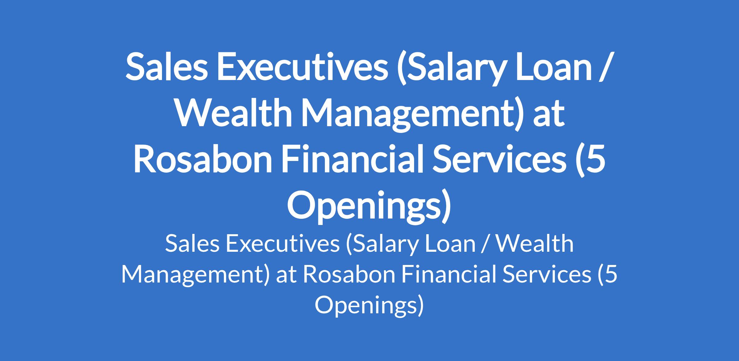 Rosabon Financial Services (RFS) Limited is recruiting to fill the position of: Sales Executive (Salary Loan / Wealth Management). The position is located in Abuja (FCT), Benue, Lagos, Ogun, and Osun States. Salary: N80,000 - N150,000 monthly. Interested candidates should possess a B.Sc Degree in Finance, Economics or a related field.