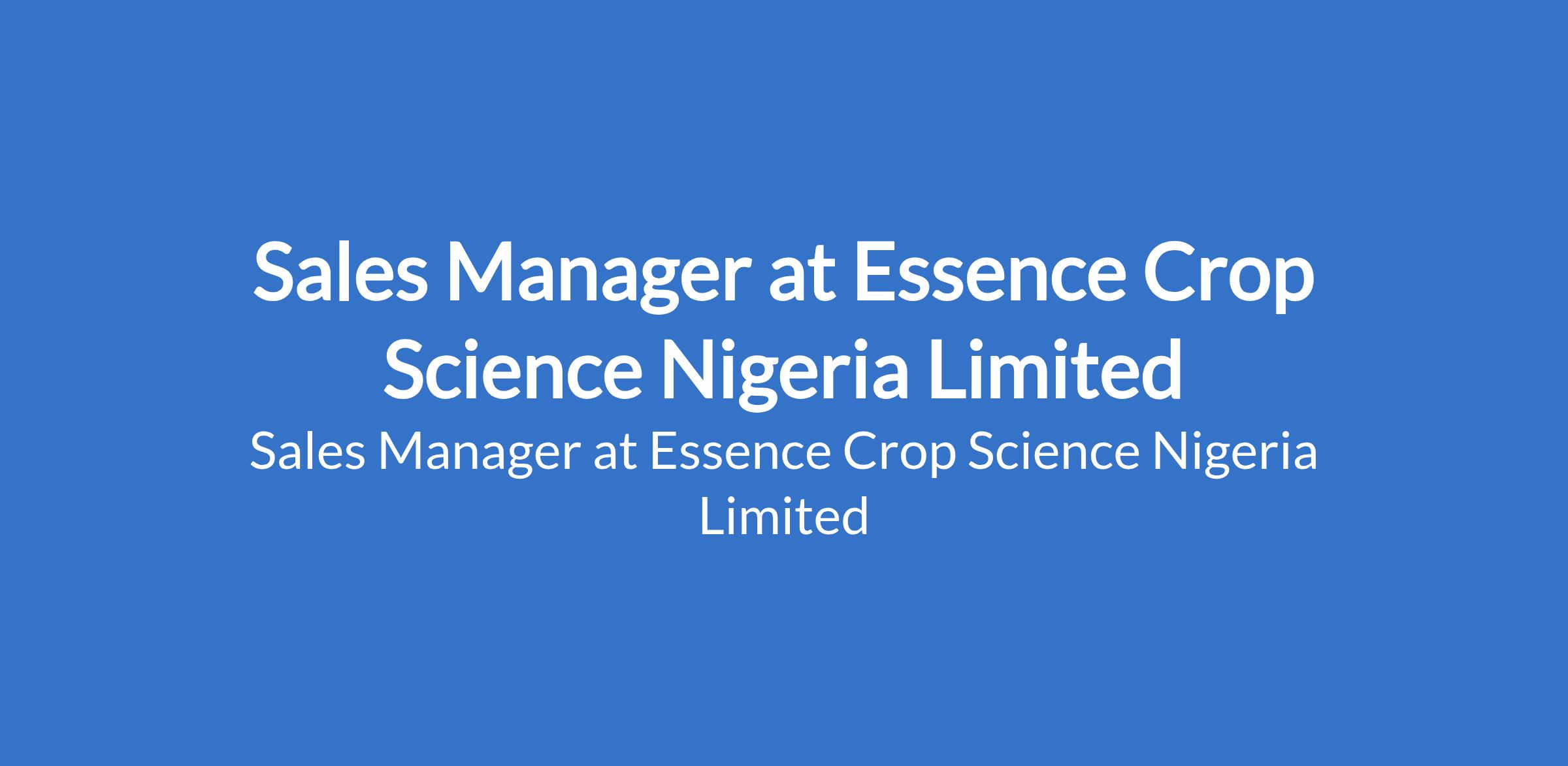 Essence Crop Science Nigeria Limited is recruiting to fill the position of: Sales Manager. The position is located in Lekki, Lagos State. Salary: N500,000 - N700,000 monthly. Interested candidates should possess a Bachelors Degree in Agriculture, Agronomy, or related fields (MBA preferred) with 57 years of sales experience in the agro-chemical / agri-input industry.