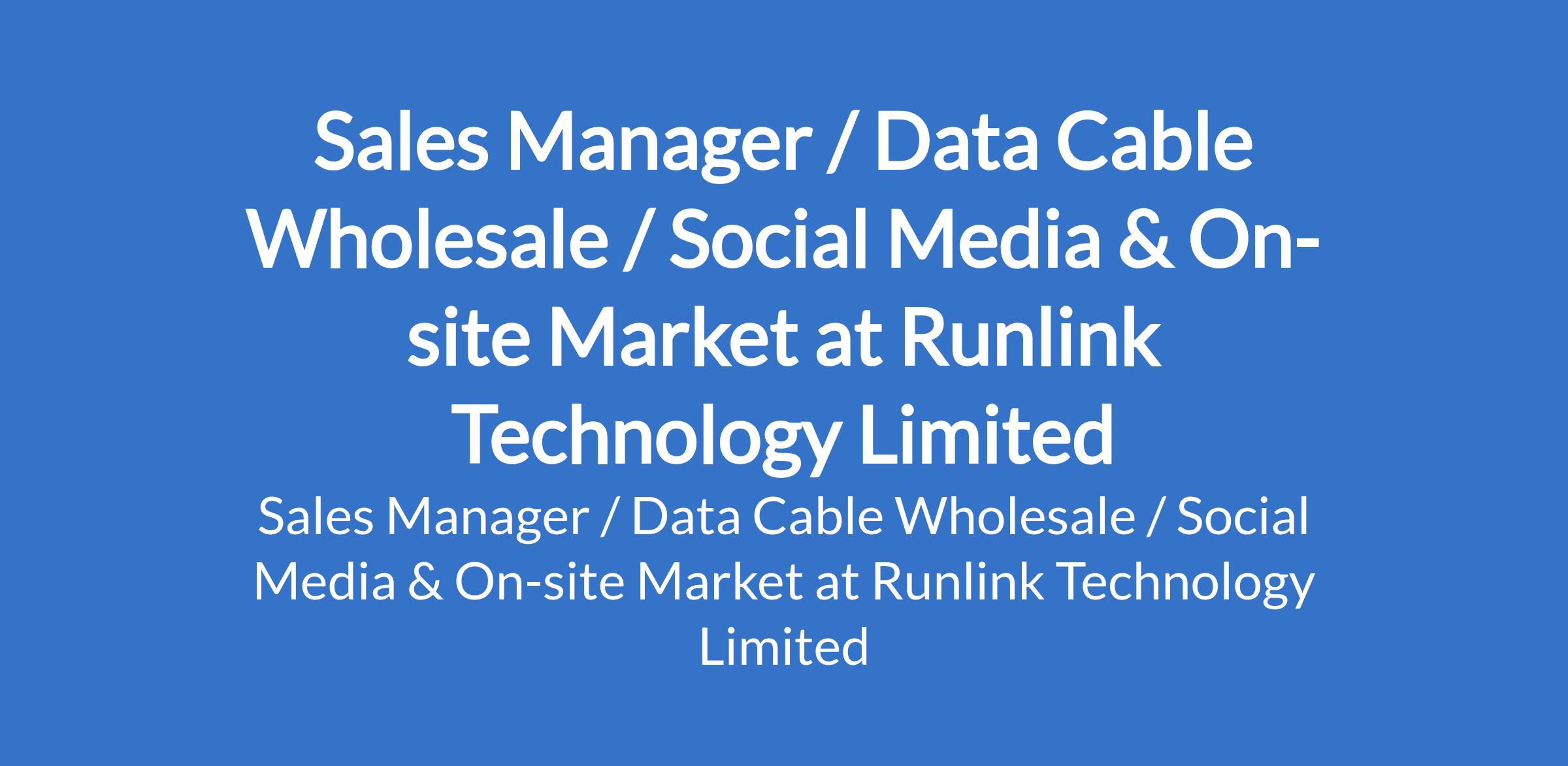 Runlink Technology Limited is recruiting to fill the position of: Sales Manager / Data Cable Wholesale / Social Media & On-site Market. The position is located in Lagos State. Salary: N100,000 - N150,000 / month. Interested candidates should possess relevant qualifications with 1+ years of sales/retail experience in Nigeria (mobile accessories is a plus).
