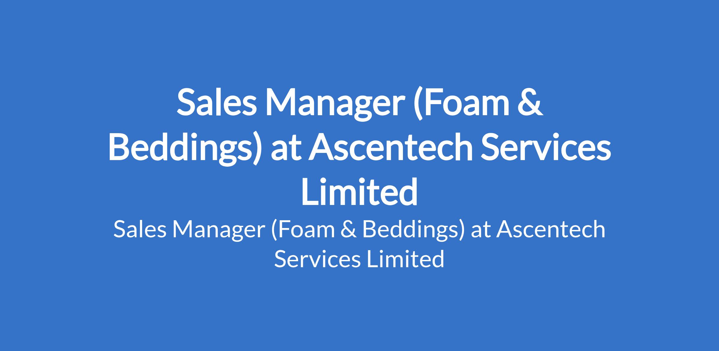Ascentech Services Limited is recruiting to fill the position of: Sales Manager (Foam & Beddings). The position is located in Lagos State. Interested candidates should possess a Bachelors Degree in Business Administration, Marketing, or related fields with 58 years sales experience infoam/bedding industry.
