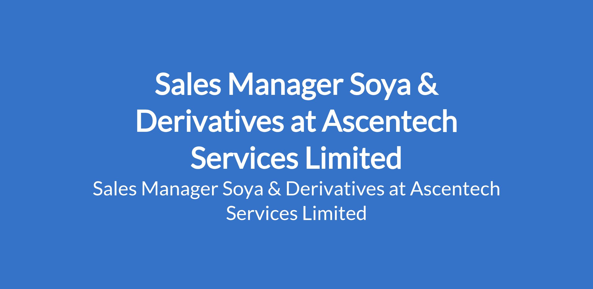 Ascentech Services Limited is recruiting to fill the position of: Sales Manager Soya & Derivatives. The position is located in Ibadan, Oyo State. Interested candidates should possess an HND/BSc in Agriculture, Agribusiness, Marketing, or related field with 13 years experience in sales coordination, billing, or B2B sales.