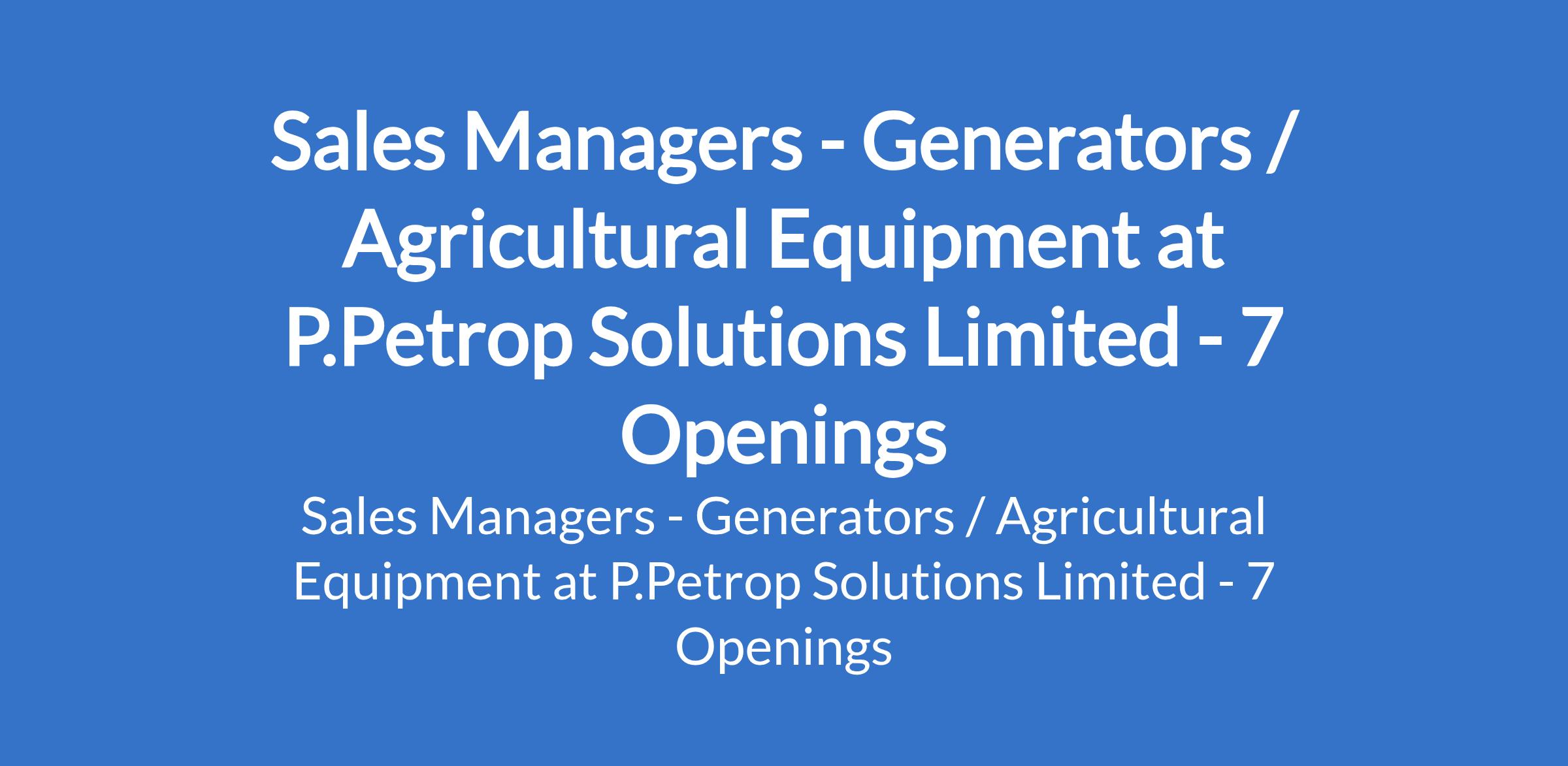 P.Petrop Solutions Limited is recruiting to fill the position of: Sales Manager - Generator / Agricultural Equipment. The position is located in Abuja (FCT), Gombe, Kaduna, Kano, Katsina, Lagos, and Nasarawa States. Salary: N500,000 - N800,000 per month. Interested candidates should possess a Bachelor's Degree in Business, Marketing, Engineering, or a related field, experience in B2B sales and corporate client acquisition with 5 - 12 years' experience in generator, power, and agricultural equipment, or industrial machinery sales.