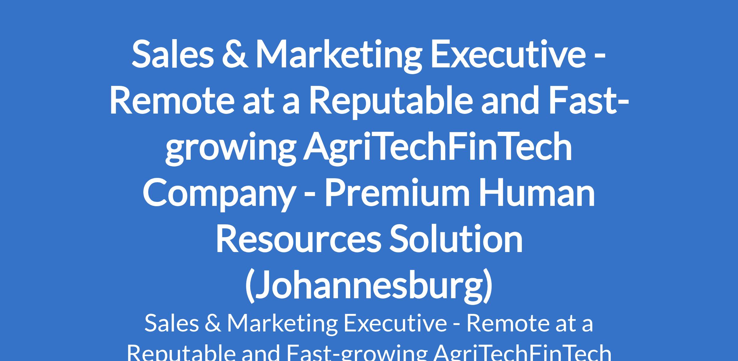 Premium Human Resources Solution - Our client, a Reputable and Fast-growing AgriTechFinTech Company is recruiting to fill the position of: Sales & Marketing Executive (Remote). The position is located in Johannesburg. Interested candidates should possess an OND / HND / B.Sc Degree in Business Administration, Agriculture, Finance, or a related field with 1 year experience in Sales or Marketing.