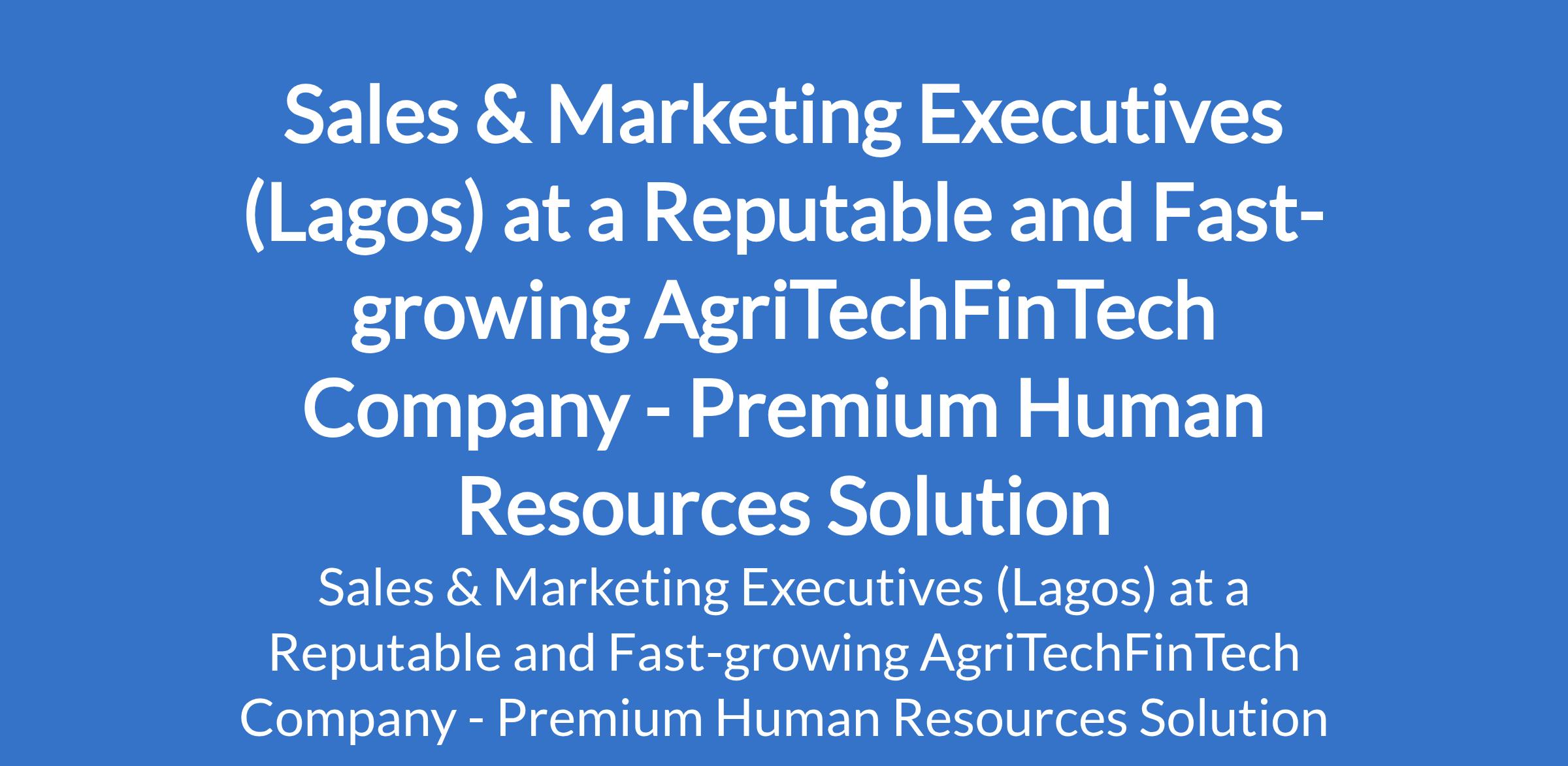Premium Human Resources Solution - Our client, a reputable and fast-growing AgriTechFinTech company is recruiting to fill the position of: Sales & Marketing Executive. The position is located in Lagos State. Interested candidates should possess a Diploma or a Bachelor's Degree in Business Administration, Agriculture, Finance, or a related field with 1 year experience in Sales or Marketing (Preferably in fintech, agritech, or financial Services).