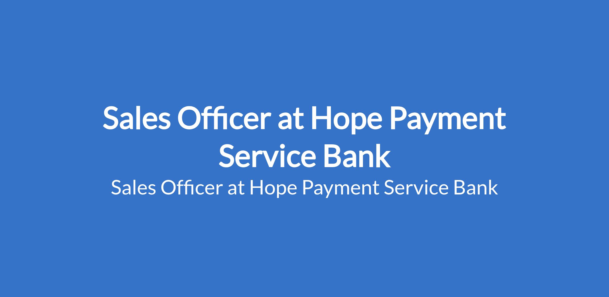 Hope Payment Service Bank Limited is recruiting to fill the position of: Sales Officer. The position is located in Onitsha, Anambra State. Interested candidates should possess minimum of a first Degree in any discipline with 0 - 2 years experience in Mobile Money, FMCG, Telcos and Aggregators sectors and must live in Onitsha or the environs.