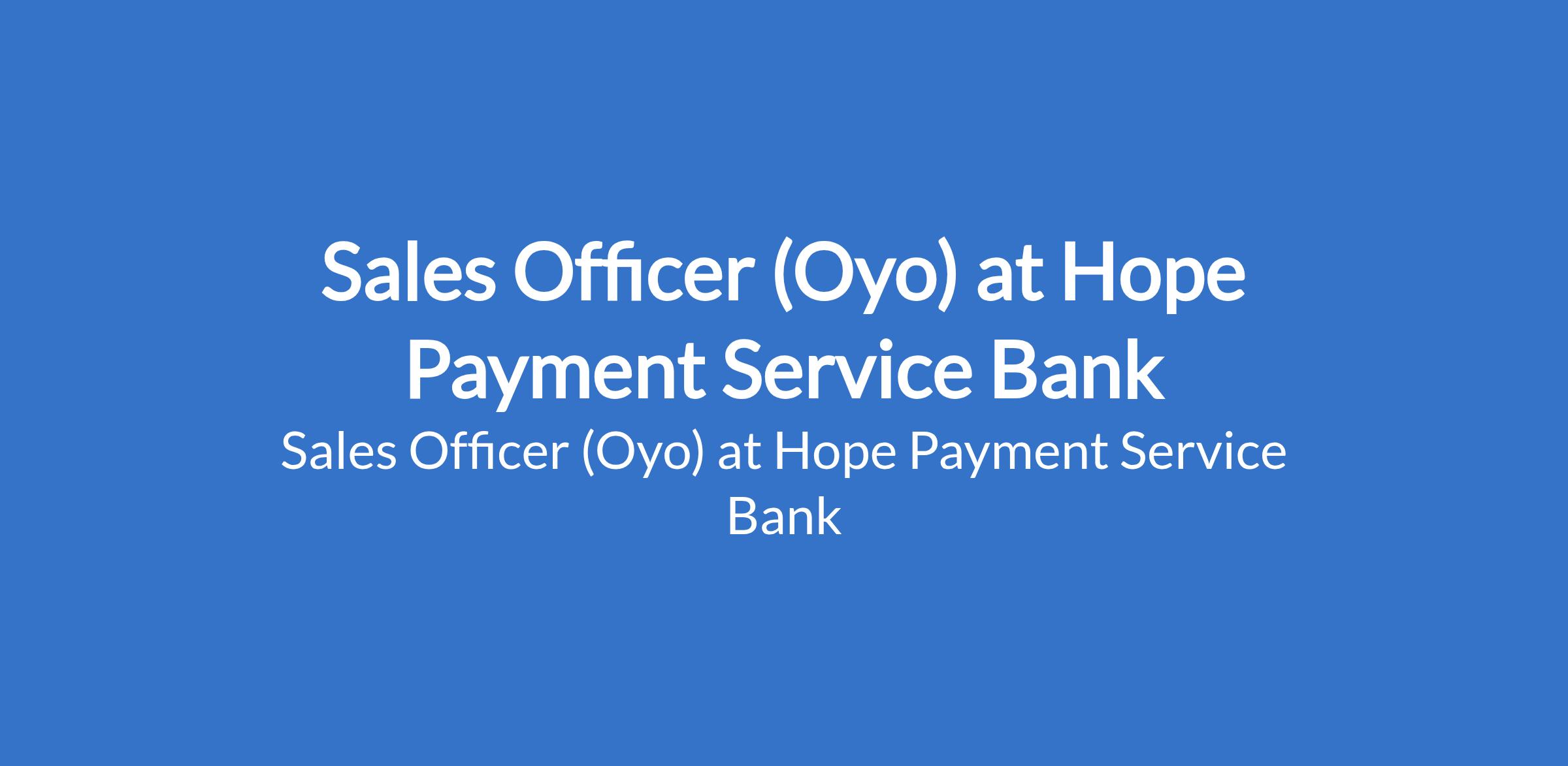Hope Payment Service Bank is recruiting to fill the position of: Sales Officer. The position is located in Ibadan, Oyo State. Interested candidates should possess a minimum of First Degree in any discipline with 2 - 4 years experience in Mobile Money, FMCG, Telcos and Aggregators sectors.