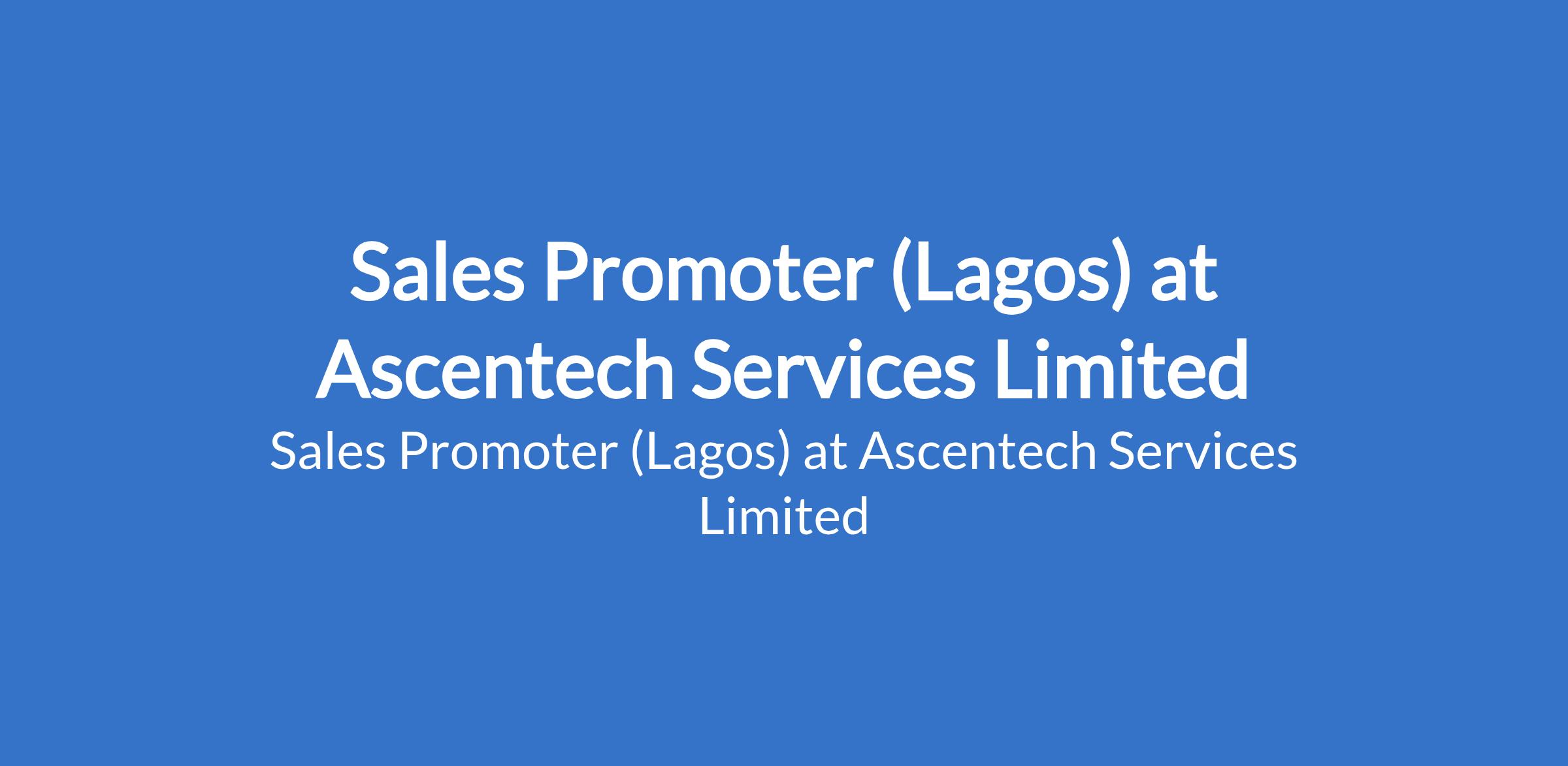 Ascentech Services Limited is recruiting to fill the position of: Sales Promoter. The position is located in Agege, Lagos State. Interested candidates should possess a minimum qualification of SSCE or OND with Previous sales or product promotion experience.
