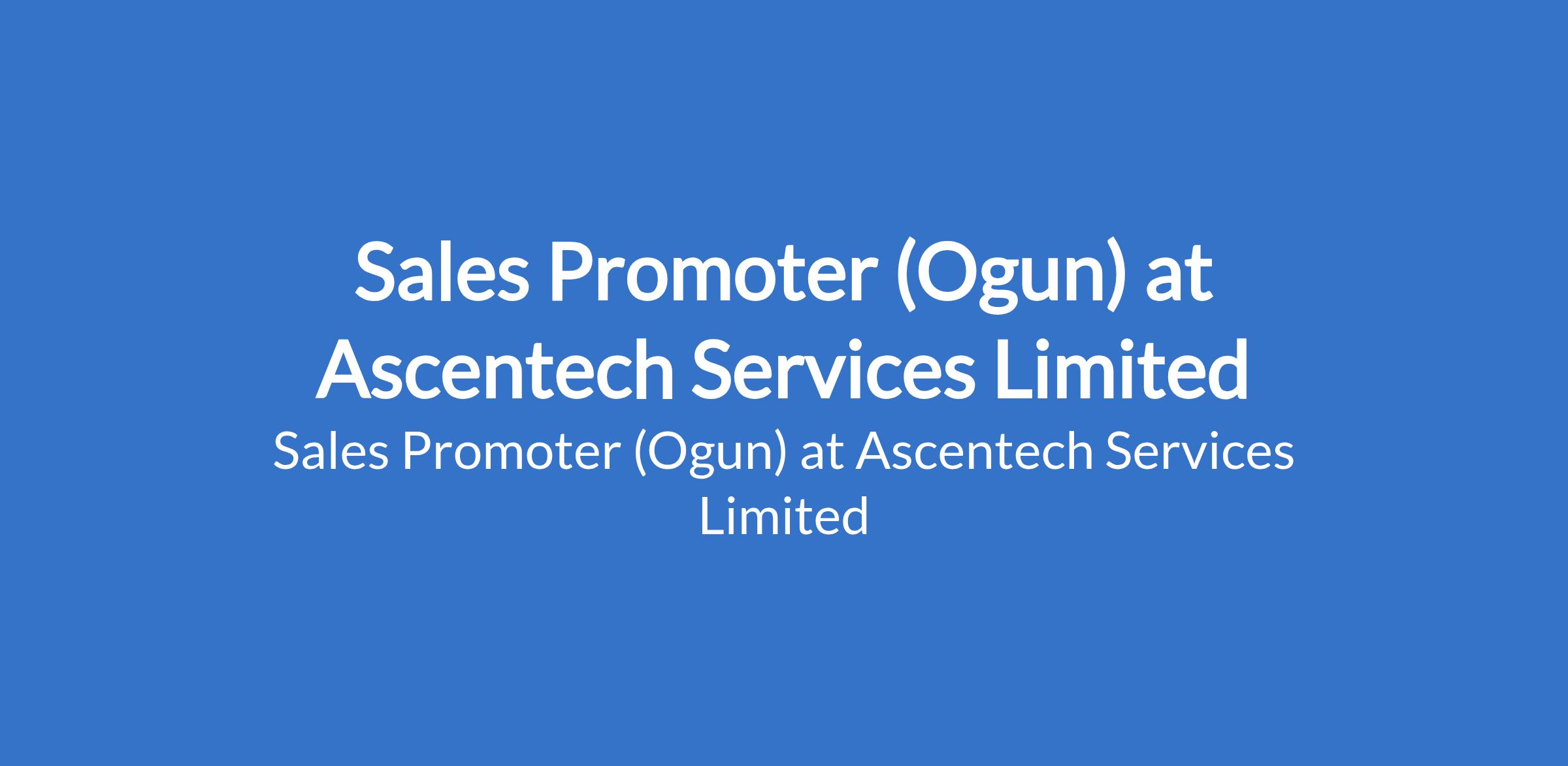 Ascentech Services Limited is recruiting to fill the position of: Sales Promoter. The position is located in Ifo, Ogun State. Interested candidates should possess a minimum qualification of an SSCE / OND with previous work experience in sales or product promotion.