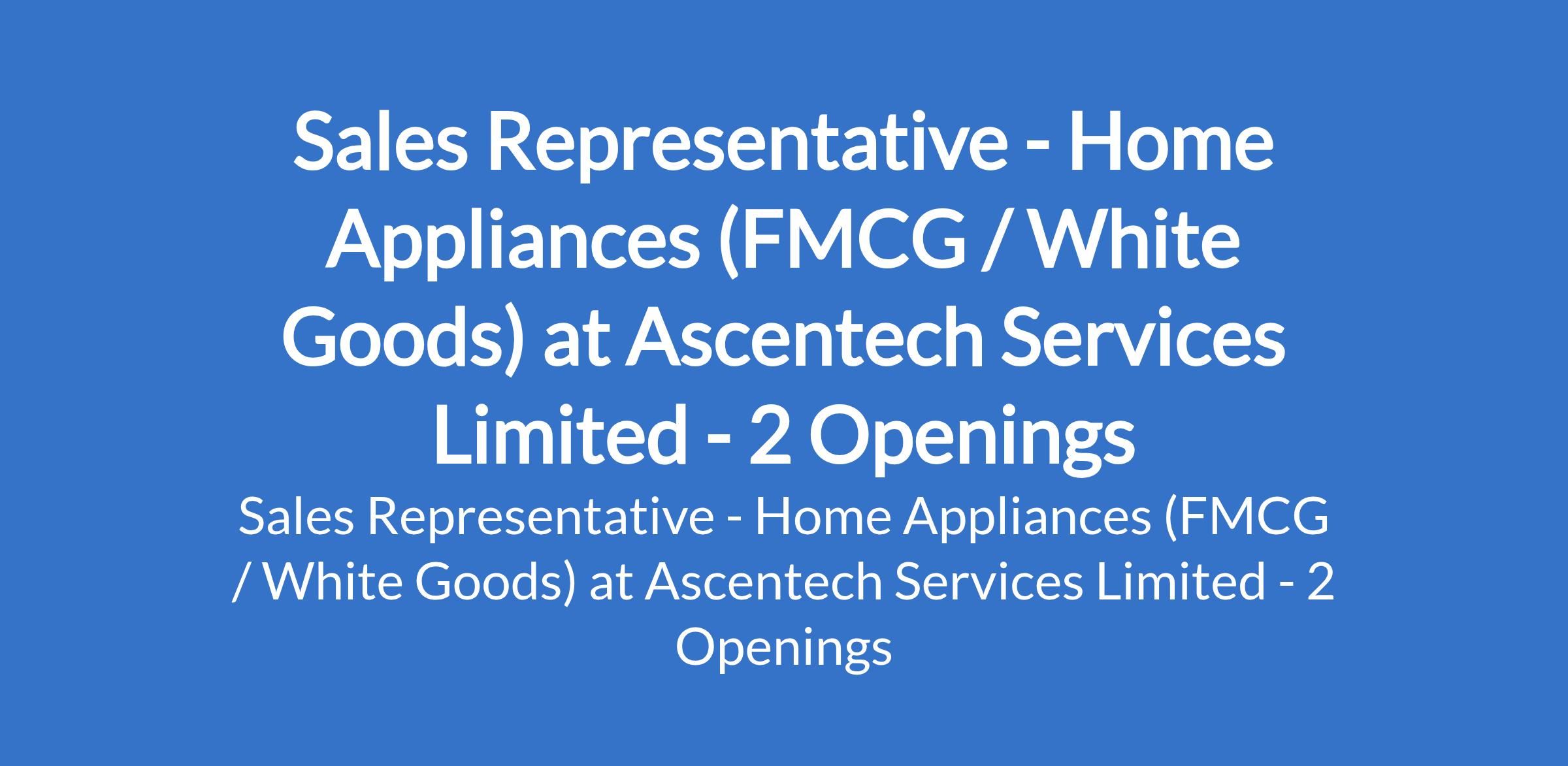 Ascentech Services Limited is recruiting to fill the position of: Sales Representative - Home Appliances (FMCG / White Goods). The position is located in Kano & Ibadan - Oyo States. Salary: N250,000 / month. Interested candidates should possess relevant qualifications with a minimum of 1 year sales experience (or at least several months with competitors in FMCG/white goods).