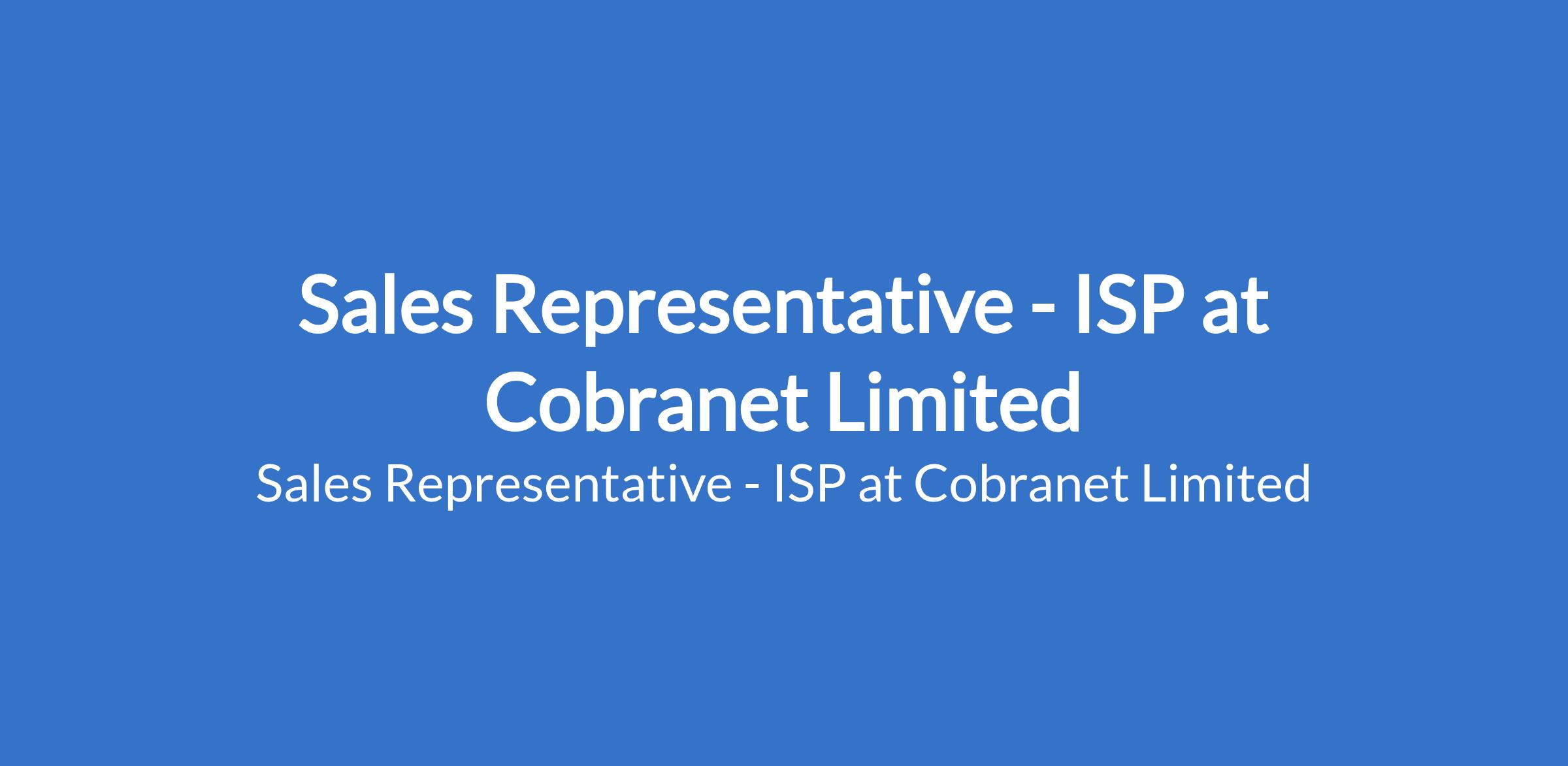 Cobranet Limited is recruiting to fill the position of: Sales Representative - ISP. The position is located in Lagos State. Interested candidates should possess a minimum of a B.Sc. Degree in any relevant field with 3 5 years of Cognate Experience in an ISP firm.