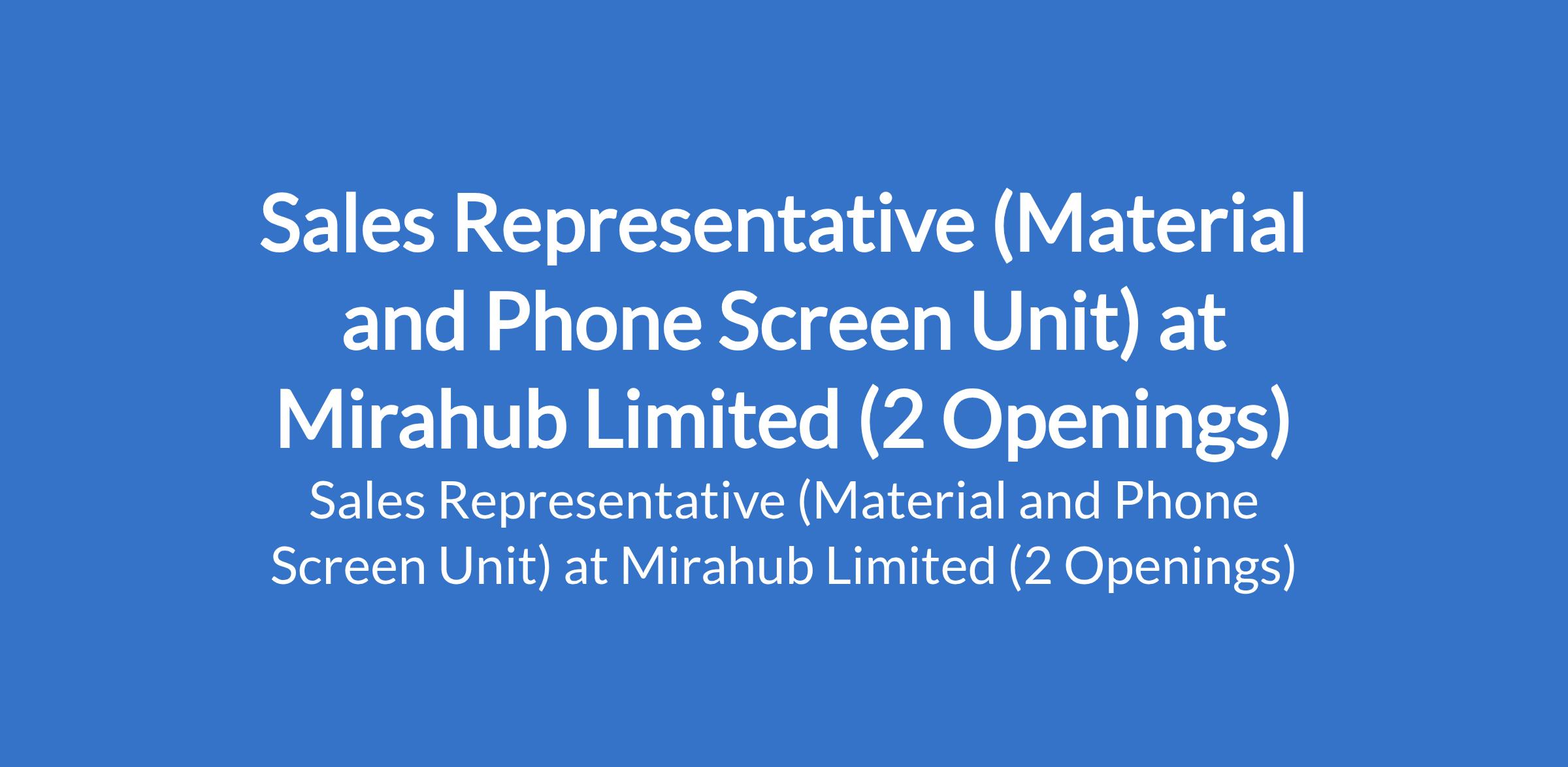 Mirahub Limited is recruiting to fill the position of: Sales Representative (Material and Phone Screen Unit). The position is located in Alaba and Lagos Island, Lagos State. Interested candidates should possess minimum qualification of an OND or SSCE qualification with previous sales experience (especially in phone accessories or electronics).