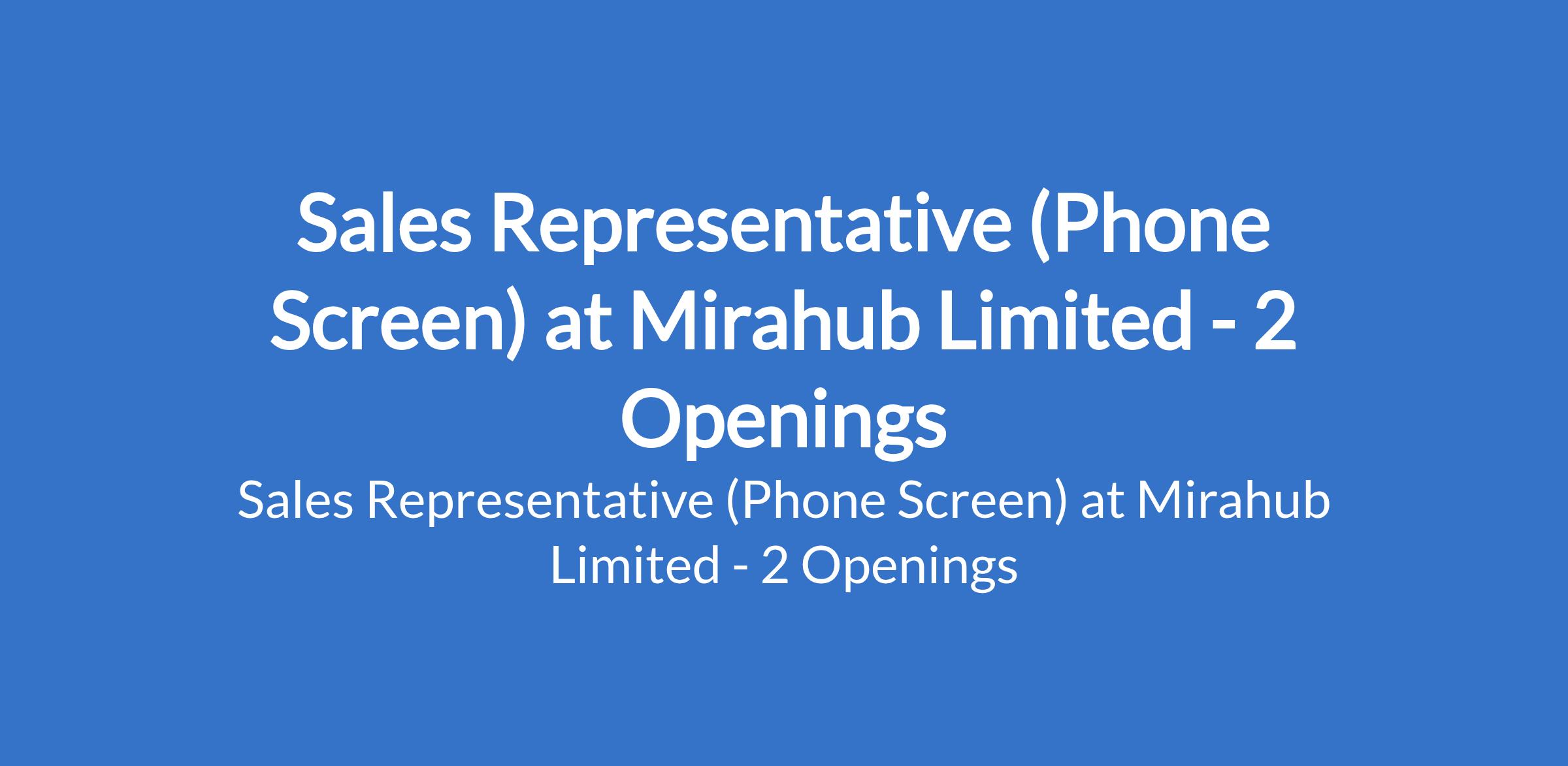 Mirahub Limited is recruiting to fill the position of: Sales Representative (Phone Screen). The position is located in Alaba & Lagos Island - Lagos State. Interested candidates should possess an OND or NCE qualification with 02 years of experience in sales or customer service; experience in phone accessories, repairs, or warranty services is an advantage.