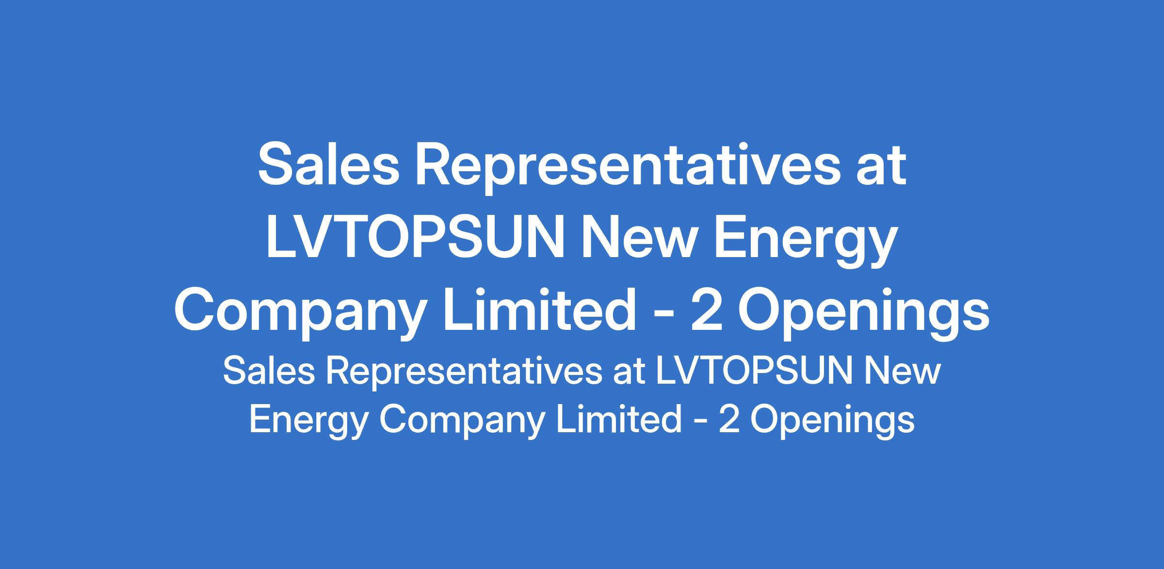 LVTOPSUN New Energy Company Limited is recruiting to fill the position of: Sales Representative. The position is located in Abuja & Lagos State. Salary: N100,000 - N120,000 Monthly. Interested candidates should possess an HND /NCE / First Degree with 3 - 6 years work experience. For Lagos candidates, only residents around Amuwo Odofin and Festac axis would be considered; while those residing around Apo Urban Market and environs are preferred for Abuja.