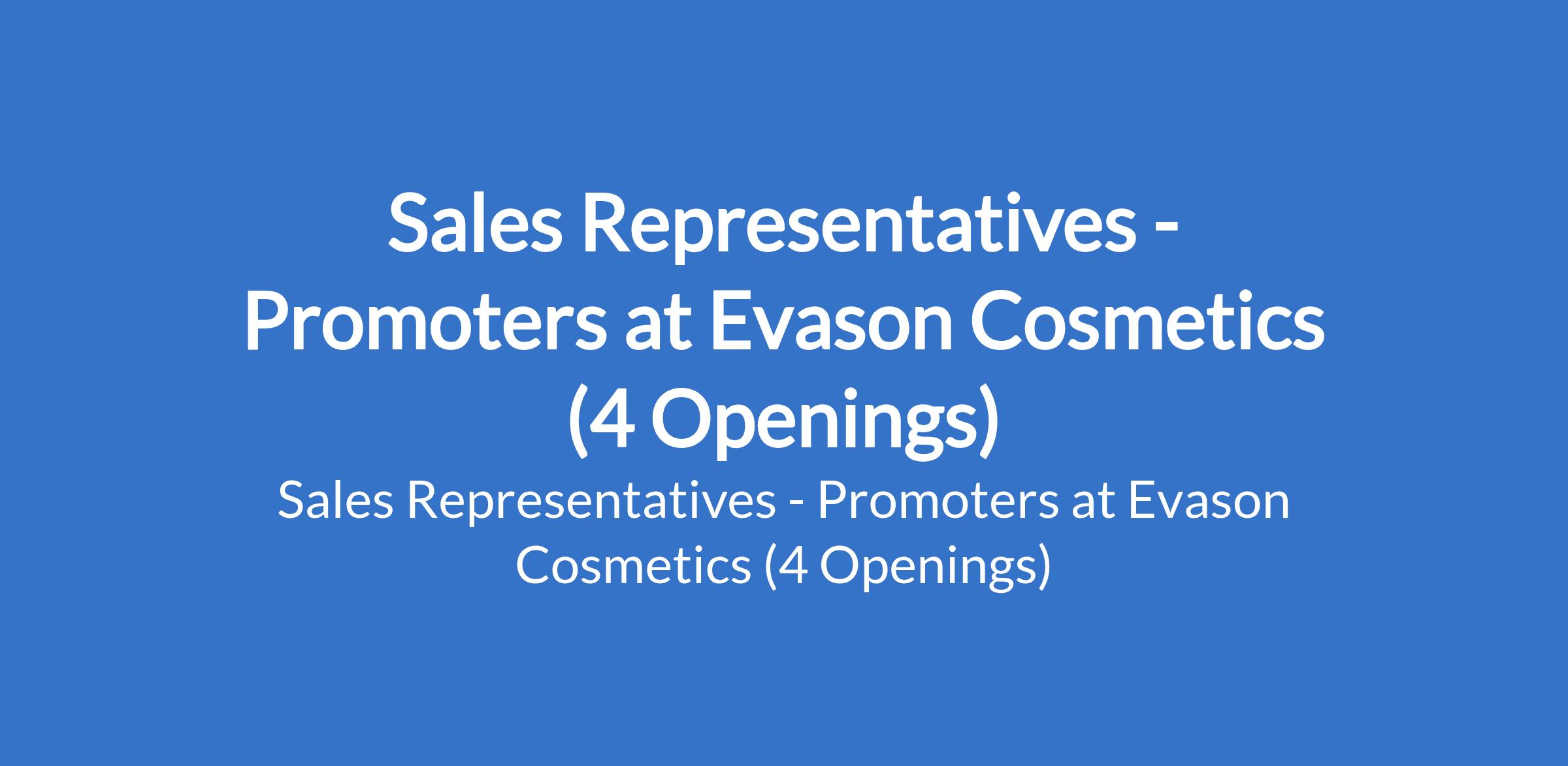 Evason Cosmetics is recruiting to fill the position of: Sales Representative - Promoter. The position is located in Abuja (FCT), Kano, Lagos, and Port Harcourt - Rivers States. Interested candidates should possess minimum of an HND / Bachelors Degree in Marketing, Business Administration or related fields with 2 3 years sales experience (FMCG or cosmetics industry preferred).