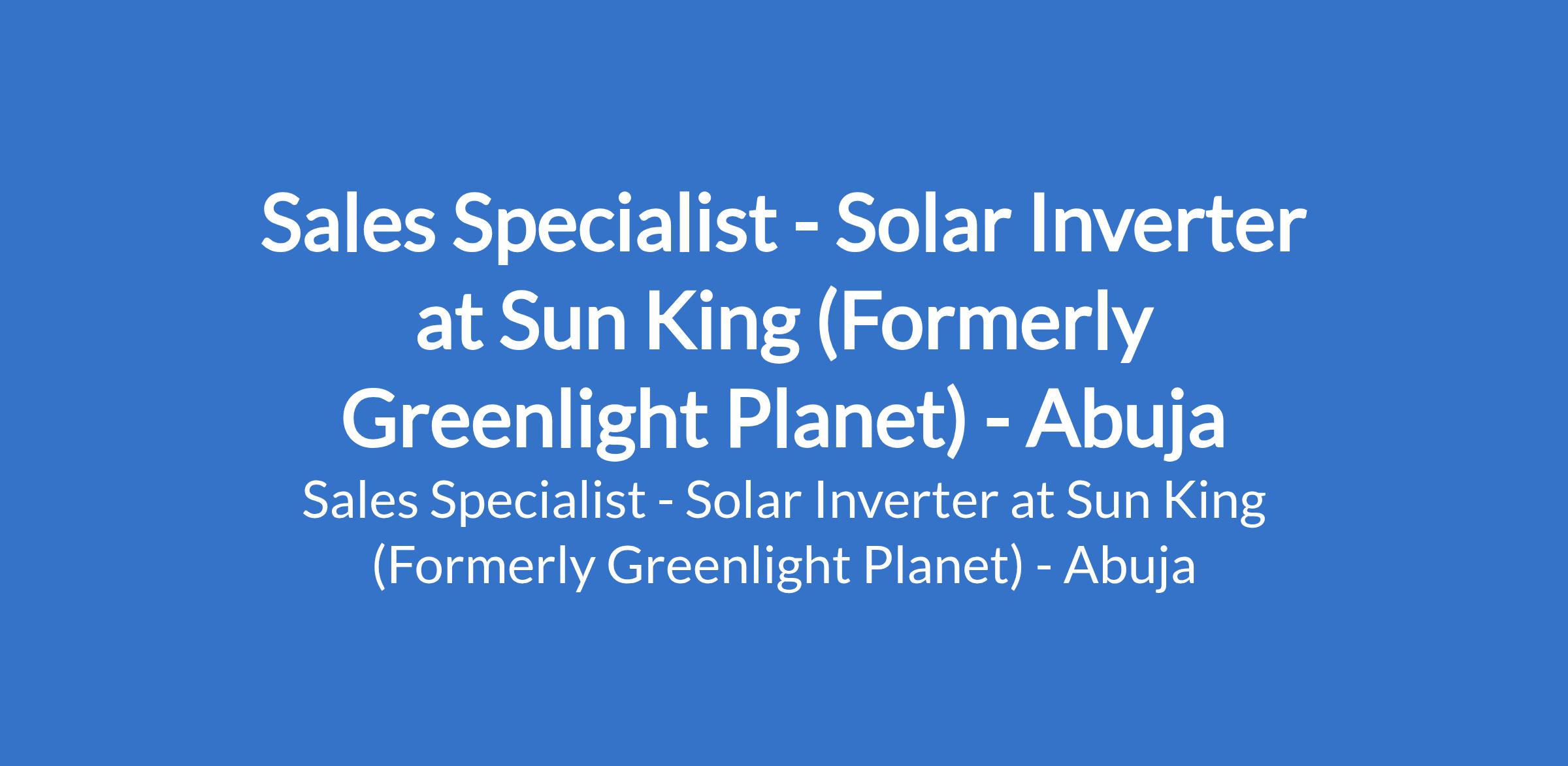 Sun King (Formerly Greenlight Planet) is recruiting to fill the position of: Sales Specialist - Solar Inverter. The position is located in Abuja (FCT). Interested candidates should possess a Degree in a Business-related field or its equivalent with at least 3 years hands on experience in inverter Sales.