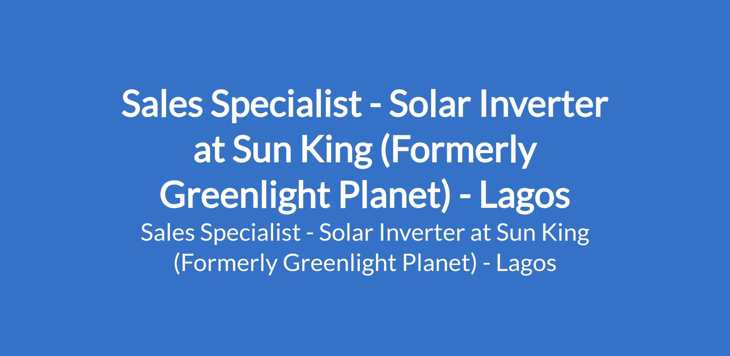 Sun King (Formerly Greenlight Planet) is recruiting to fill the position of: Sales Specialist - Solar Inverter. The position is located in Lekki, Lagos State. Interested candidates should possess a Degree in a Business-related field or it's equivalent with at least 3 years hands on experience in inverter Sales.