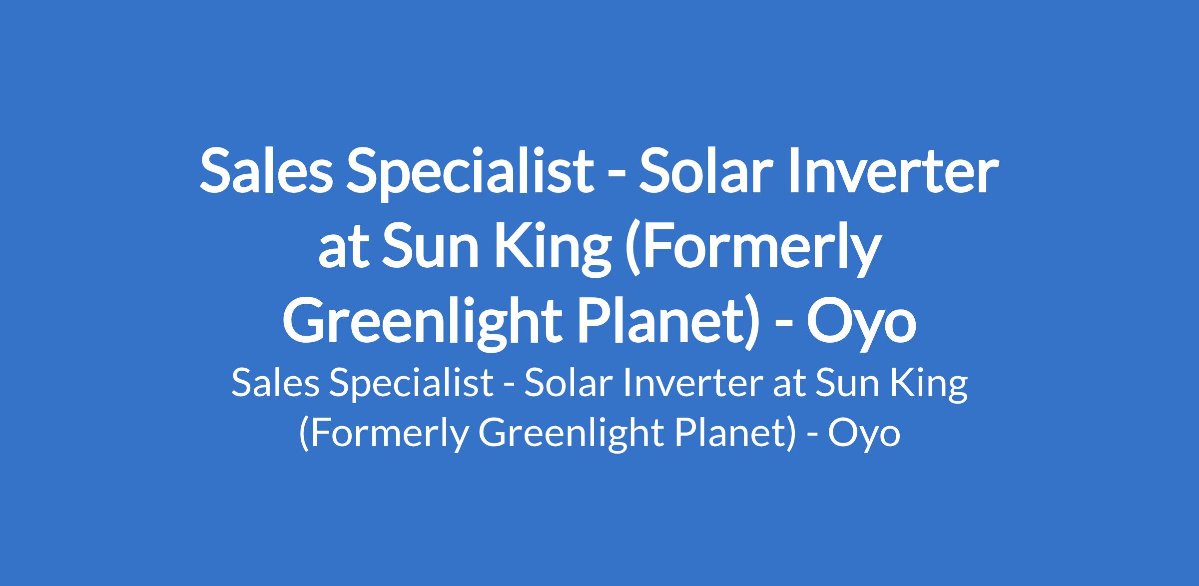 Sun King (Formerly Greenlight Planet) is recruiting to fill the position of: Sales Specialist - Solar Inverter. The position is located in Ibadan, Oyo State. Interested candidates should possess a Degree in a Business-related field or it's equivalent with at least 3 years hands on experience in inverter Sales.