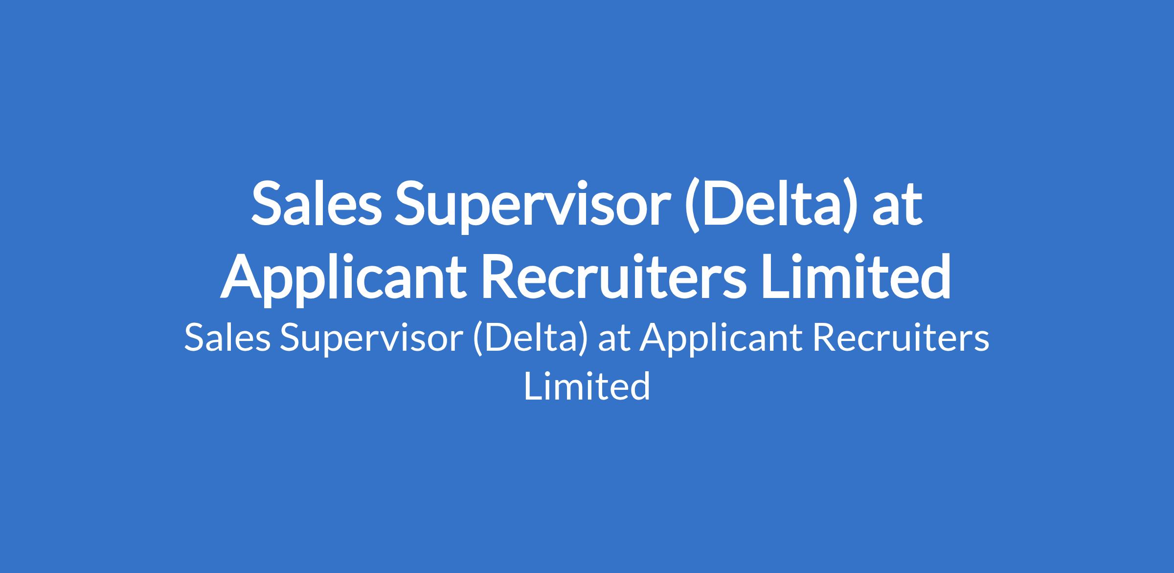 Applicant Recruiters Limited is recruiting to fill the position of: Sales Supervisor. The position is located in Asaba, Delta State. Interested candidates should possess a Bachelors Degree in Business Administration, Marketing, or related field (preferred) with proven experience in sales, with 1 3 years in a supervisory role.