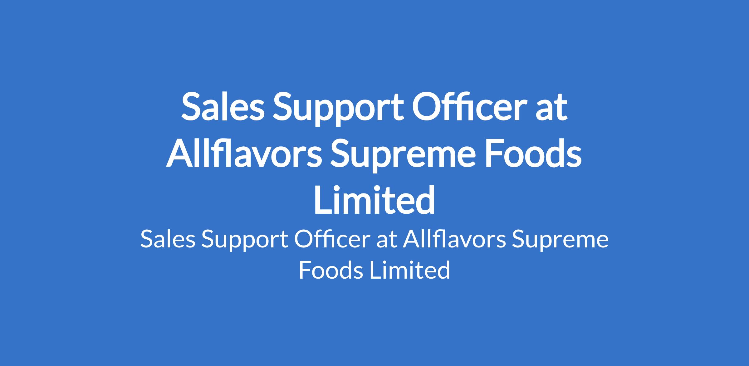 Allflavors Supreme Foods Limited is recruiting to fill the position of: Sales Support Officer. The position is located in Amuwo Odofin, Lagos State. Interested candidates should possess a Bachelors Degree in Business Administration, Marketing, or a related field with 1-3 years of experience in sales support, customer service, or an FMCG environment.