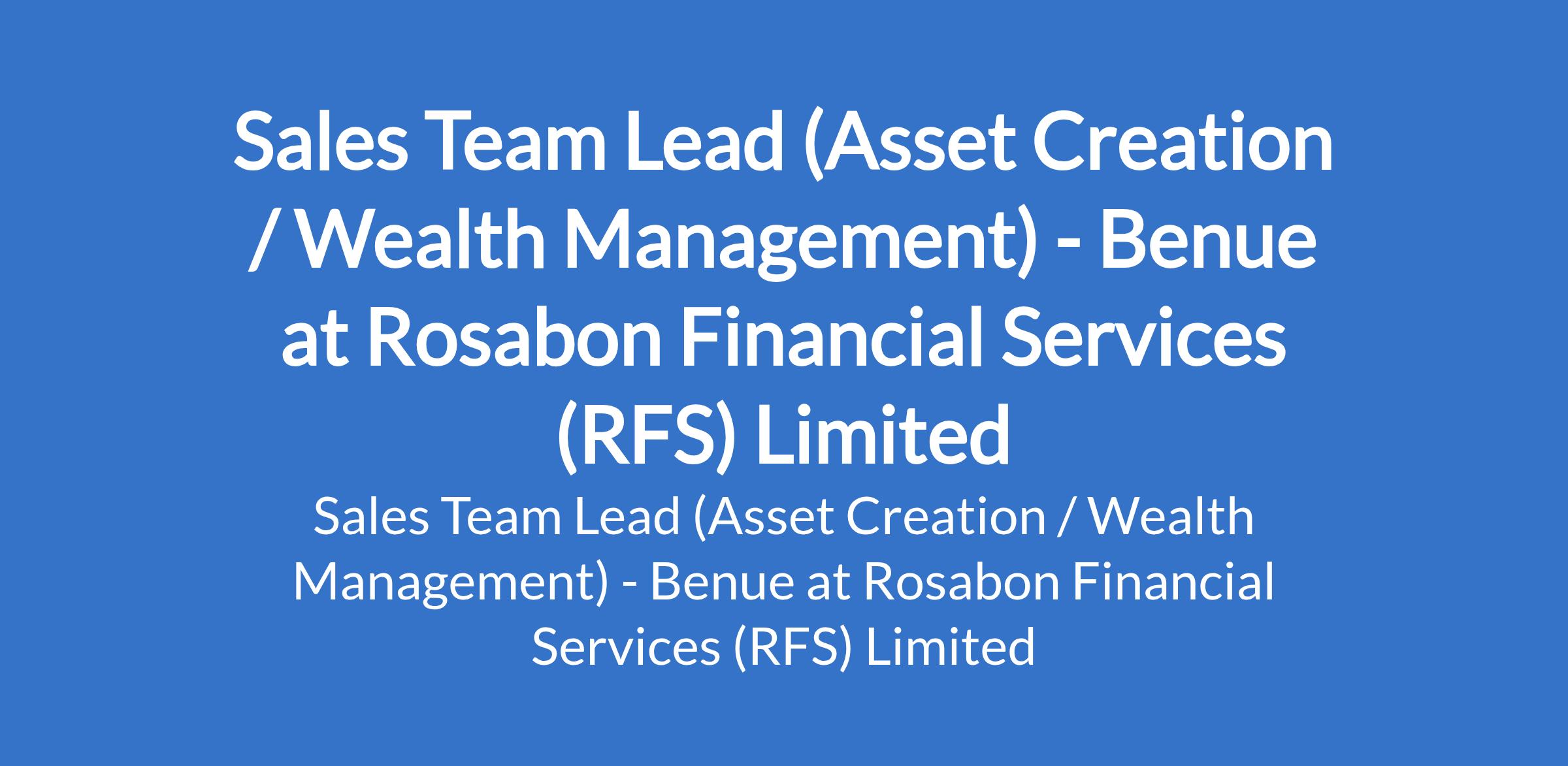 Rosabon Financial Services (RFS) Limited is recruiting to fill the position of: Sales Team Lead (Asset Creation / Wealth Management). The position is located in Benue State. Salary: N220,000 - N300,000 per month. Interested candidates should possess a First Degree in any discipline with 5 years+ of progressive experience in sales and marketing of financial products (Consumer Lending).