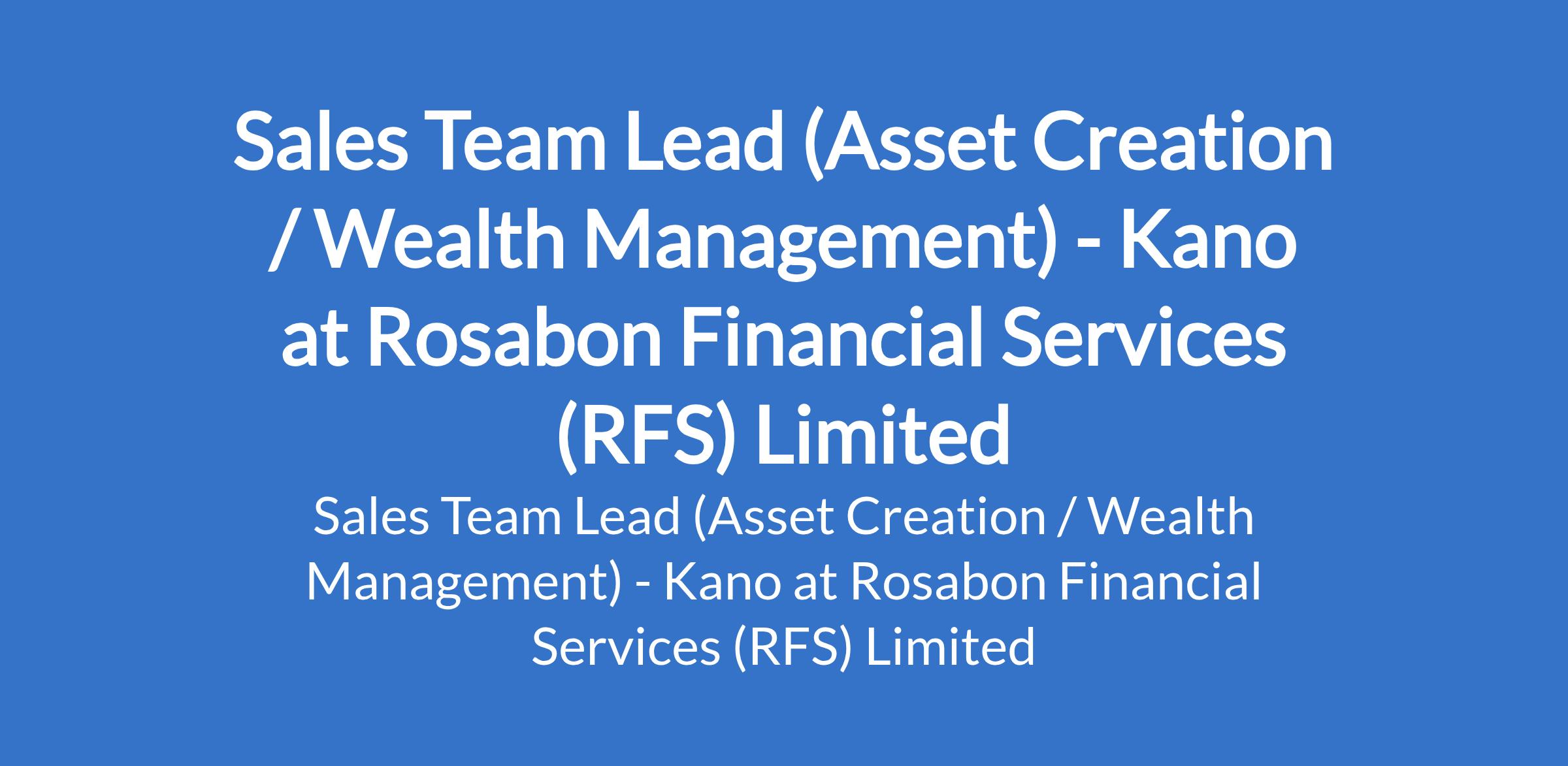Rosabon Financial Services (RFS) Limited is recruiting to fill the position of: Sales Team Lead (Asset Creation / Wealth Management). The position is located in Kano State. Salary: N220,000 - N300,000 per month. nterested candidates should possess a minimum education level First Degree in any discipline from a reputable academic institution with 5 years+ of progressive experience in sales and marketing of financial products (Consumer Lending).
