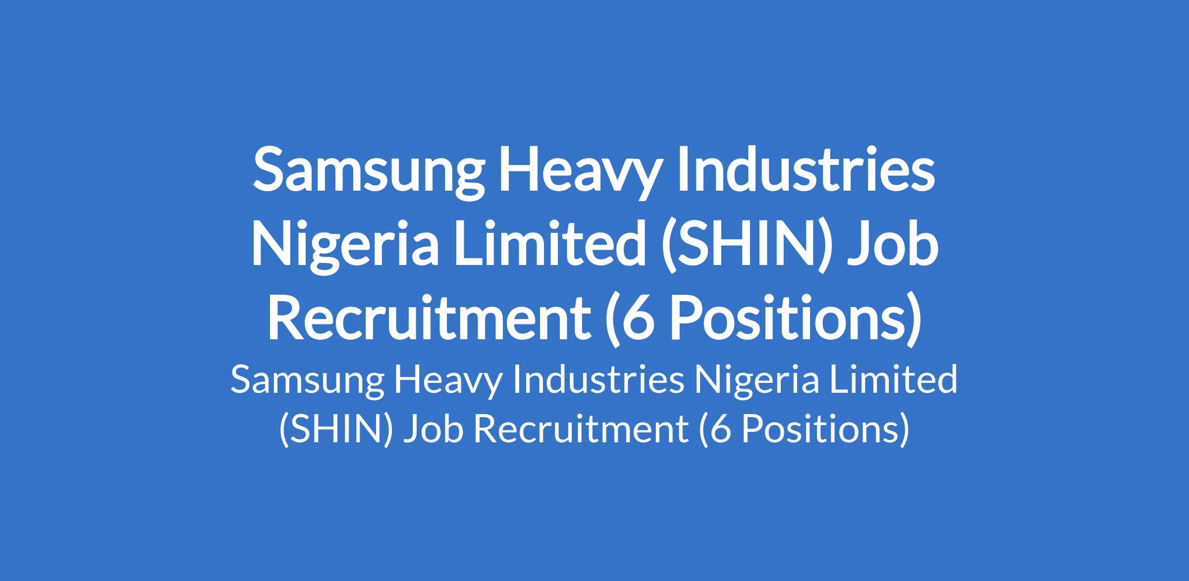 Samsung Heavy Industries Nigeria Limited (SHIN) is recruiting suitably qualified candidates to fill the following positions in Lagos State: Structural Engineer, Electrical Overhead Crane / Travelling Tower Crane Technician (EOC & TTC), Electrical Technician, enior Heavy Duty Mechanic, Structural Engineer, Technical Proposal Manager (Offshore Marine Engineering / Logistics Industry Experience), and Maintenance Officer / Admin.