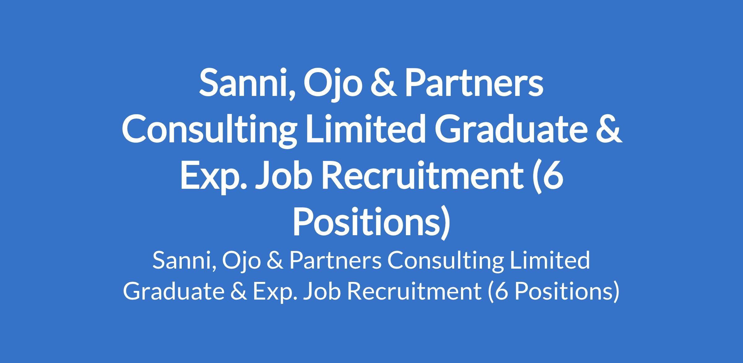 Sanni, Ojo & Partners Consulting Limited is currently recruiting suitably candidates to fill the following graduate and experienced positions in Lagos State: Account Officer, BIMCAD Specialist, Project Engineer (Civil / Structural), Senior Structural Engineer, Graduate Surveryor and Graduate Engineer (Civil / Structural).