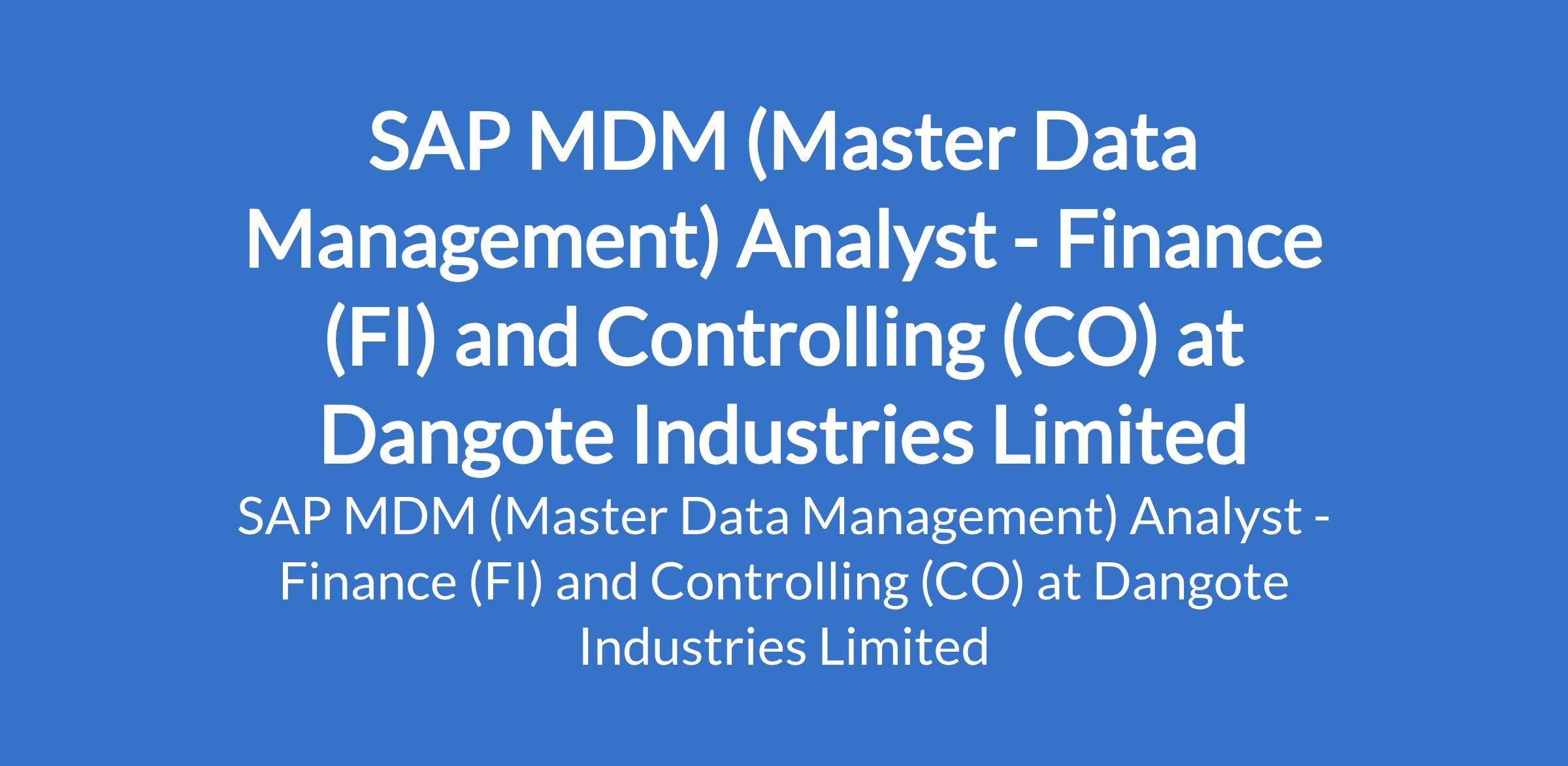 Dangote Industries Limited is recruiting to fill the position of: SAP MDM (Master Data Management) Analyst - Finance (FI) and Controlling (CO). The position is located in Lagos State. Interested candidates should possess a Bachelors degree in Information Technology, Computer Science, Finance, or a related field with 3-5 years of experience in SAP MDM, with a focus on Finance and Controlling.