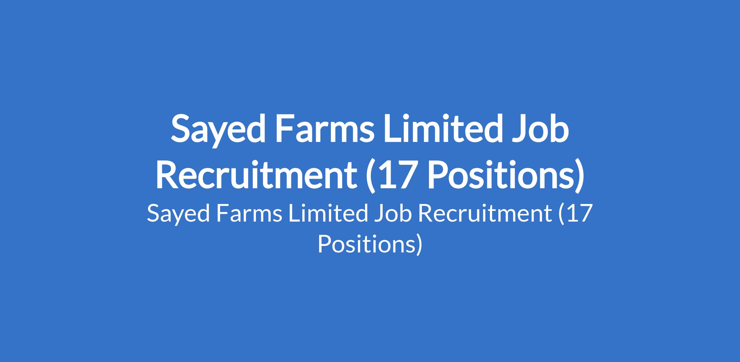 Sayed Farms Limited is recruiting suitable candidates to fill the following positions in Lagos, Oyo, Osun, Kwara, Delta and Anambra States: Female Receptionist, Stock Accountant (Male / Female), Senior Accountant (Female), Administration Officer, Account Payable Officer (Male / Female), Electrical Maintenance Supervisor - Feedmill, Mechanical Maintenance Technician, Senior Maintenance Technician - Cooling Trucks, Electrical Maintenance Supervisor, Procurement Officer, Accountant (Female), Technical Sales Representative, Cashier / In-door Sales Representative, Civil Engineer - Cum Administrator, Cashier Cum in-Door Sales Representative, Generator Maintenance Technician - Electrical, Boiler and Utility Technician, and Technical Sales Representative (South West).
