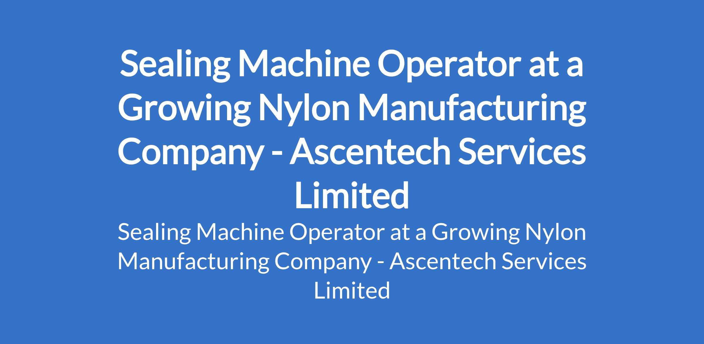 Ascentech Services Limited - Our client, a Growing Nylon Manufacturing Company is recruiting to fill the position of: Sealing Machine Operator. The position is located in Obanikoro, Lagos State. Salary: N120,000 N150,000 monthly. Interested candidates should possess relevant qualifications with 2 3 years experience in nylon / packaging production.