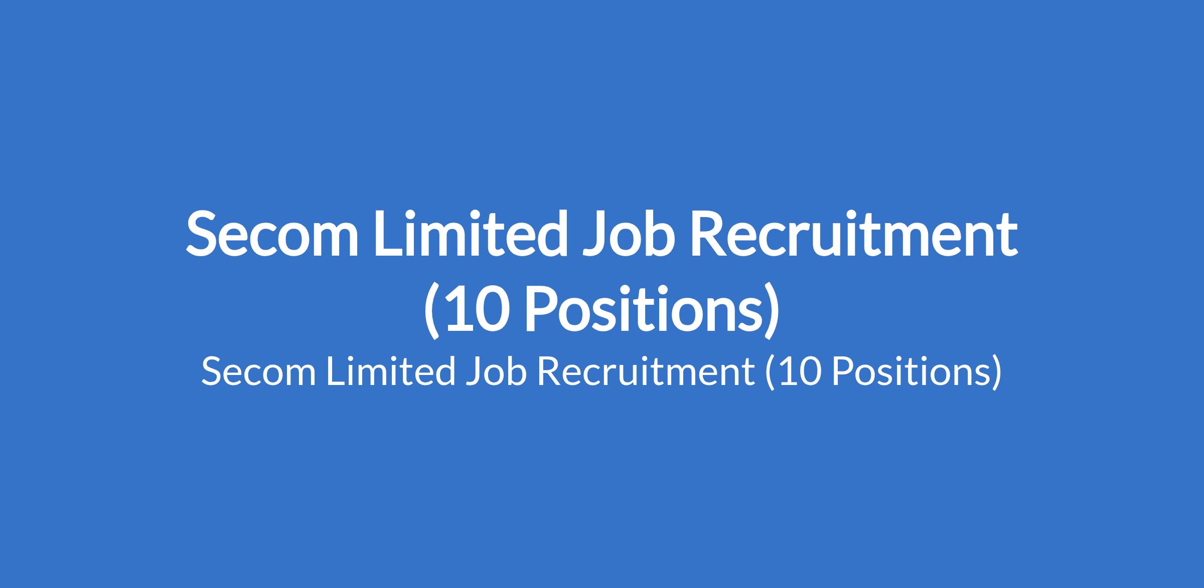 Secom Limited is recruiting suitably qualified candidates to fill the following positions in Lagos, Ekiti, Kwara, Ogun, & Ondo States: Tax Associate, Secondary Sales Representative, Accountant, Personal Driver, Storekeeper, Primary Sales Representative, Chef (Specialty in Authentic Indian Cuisine), Korope Driver, Office Administrator, and Factory Worker.